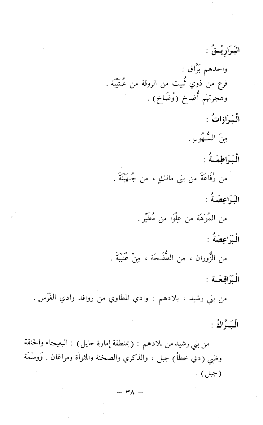 البَرَّاكُ: من بني رَشِيْد من بلادهم: " بمنطقة إمارة حايل ": البعيجاء والخنقة وضبي " دبي خطأ " جبل، والذكري والصخنة والمثواة ومراغان. ووسمة " جبل ".