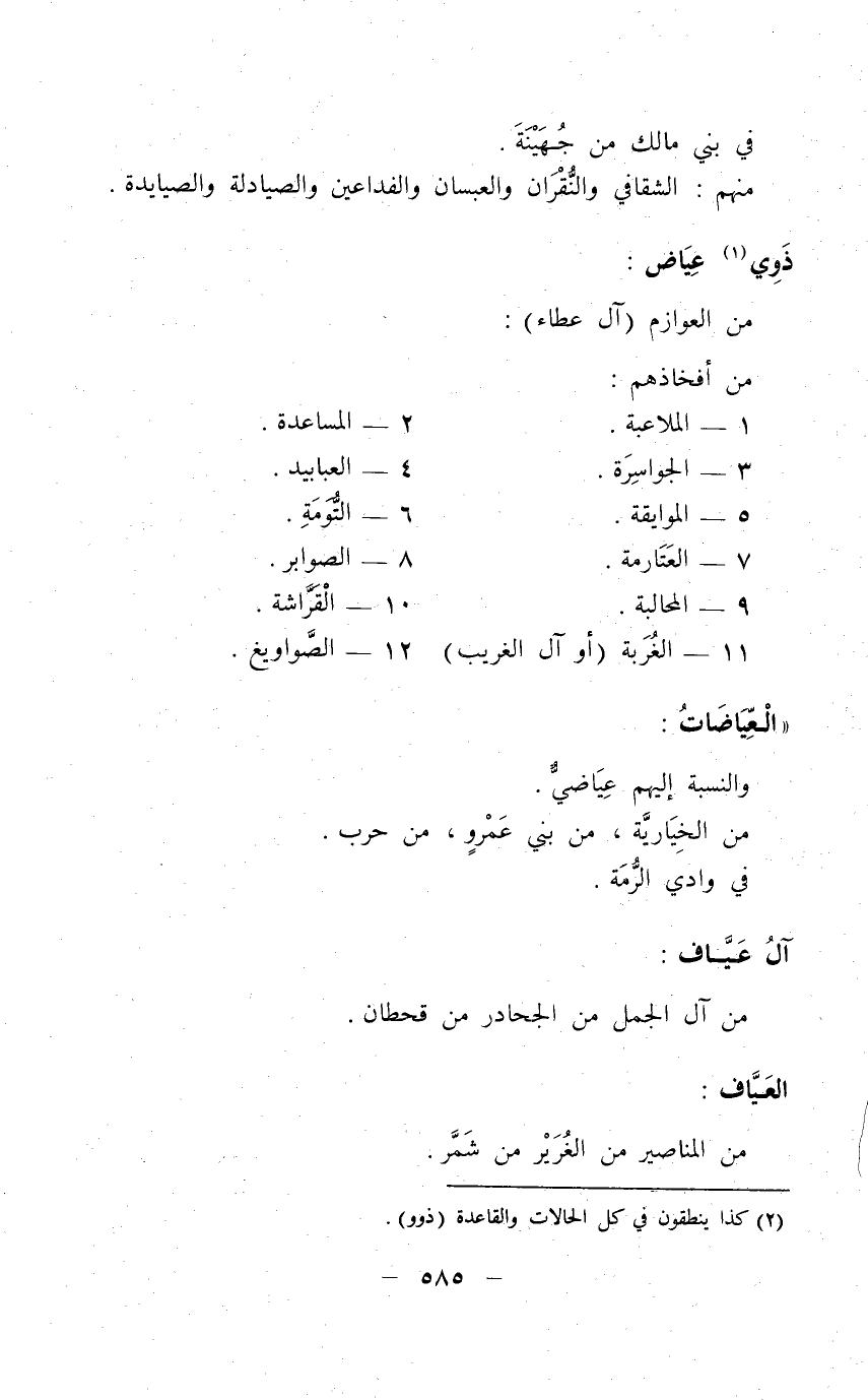 1 - الصهبة 2 - الملاعبة 3 - المُطَيْرٍات 4 - الحلف 5 - الحجيلات 6 - ذوي ميزان 7 - السقايين 8 - ذوي شطيط 9 - ذوي بدير 10 - ذوي عزيز وقد يكون ذَوُو عَونٍ هاؤلاء وذوو عَونٍ المذكورون بعدهم فرعاً واحداً.