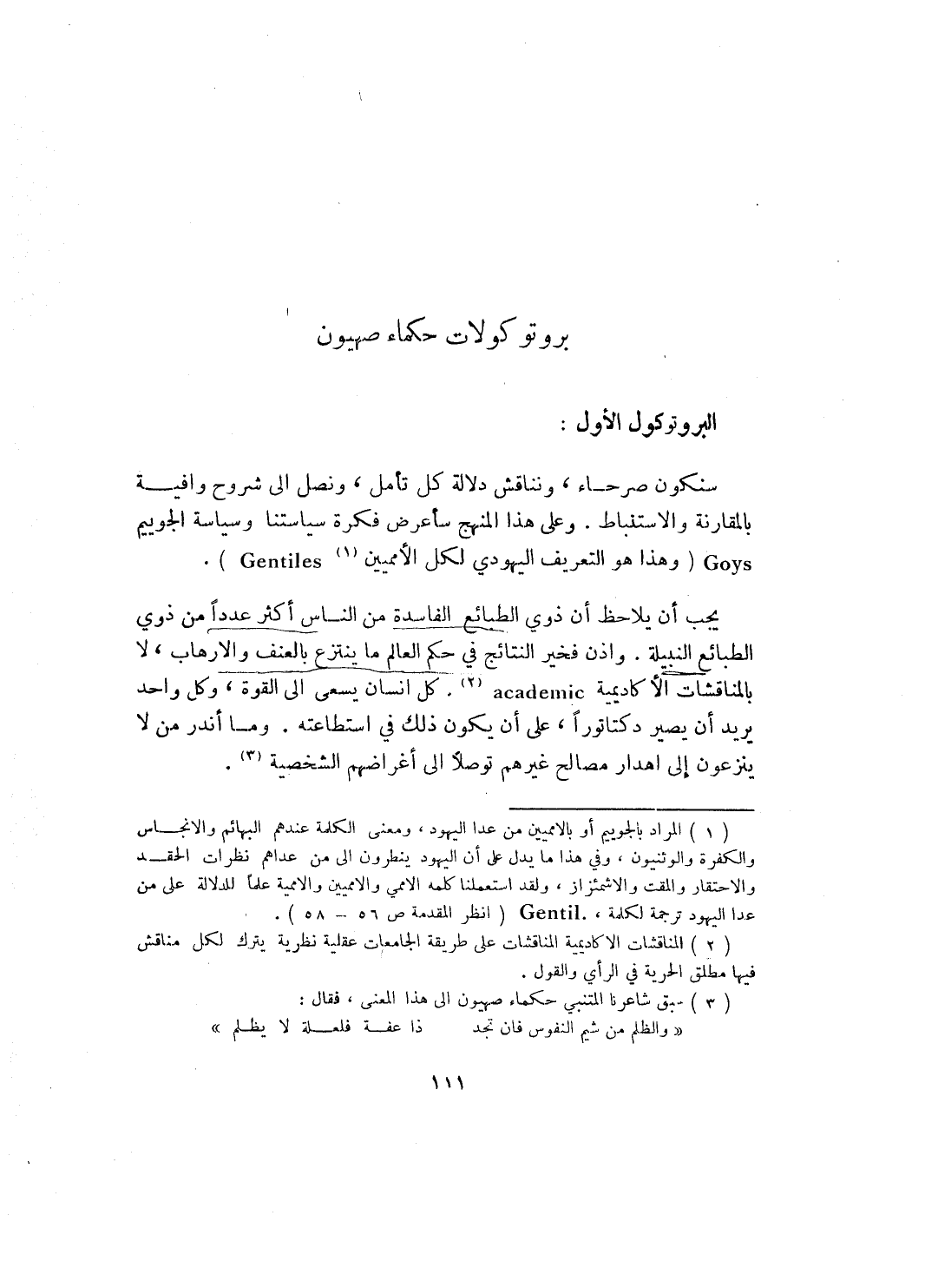 سنكون صرحاء، ونناقش دلالة كل تأمل، ونصل إلى شروح وافية بالمقارنة والاستنباط، وعلى هذا المنهج سأعرض فكرة سياستنا وسياسة الجوييم Goys ( وهذا هو التعريف اليهودي لكل الأمميين (¬1) Gentiles) .