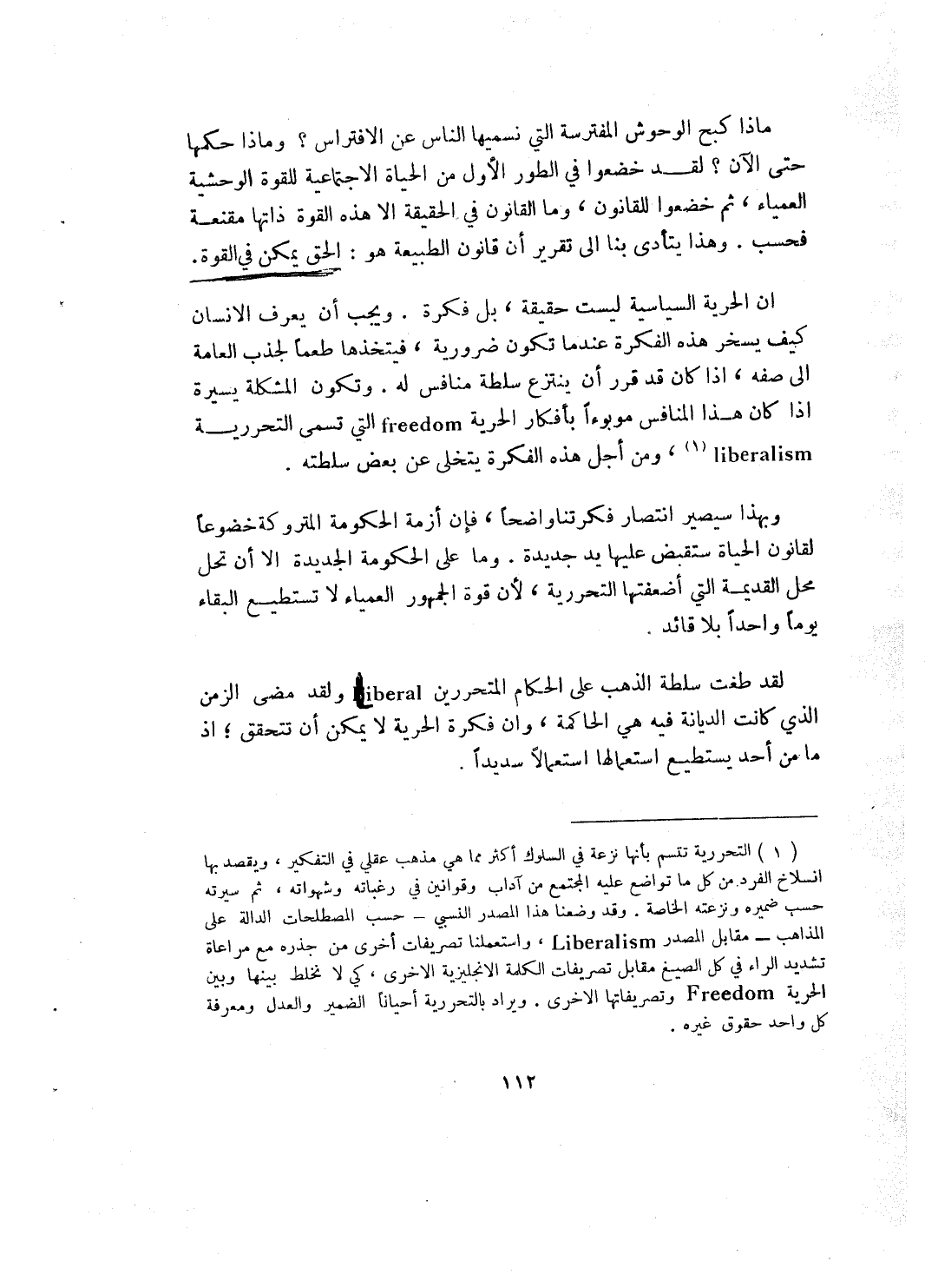 ان الحرية السياسية ليست حقيقة، بل فكرة. ويجب أن يعرف الانسان كيف يسخر هذه الفكرة عندما تكون ضرورية، فيتخذها طعماً لجذب العامة إلى صفه، إذا كان قد قرر أن ينتزع سلطة منافس له. وتكون المشكلة يسيرة إذا كان هذا المنافس موبوءاً بأفكار الحرية FREEDOM التي تسمى التحررية Liberalism (¬1) ، ومن أجل هذه الفكرة يتخلى عن بعض سلطته.