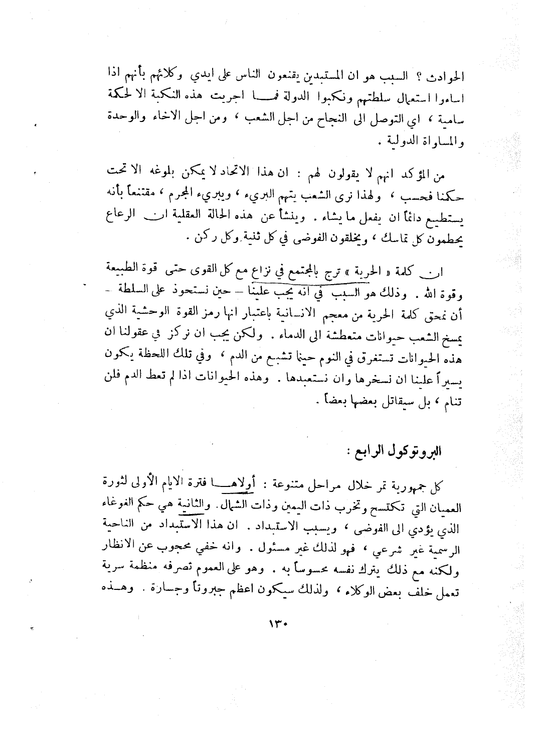 ان كلمة "الحرية" تزج بالمجتمع في نزاع مع كل القوى حتى قوة الطبيعة وقوة الله. وذلك هو السبب في انه يجب علينا ـ حين نستحوذ على السلطة ـ ان نمحق كلمة الحرية من معجم الانسانية باعتبار انها رمز القوة الوحشية الذي يمسخ الشعب حيوانات متعطشة إلى الدماء. ولكن يجب ان نركز في عقولنا ان هذه الحيوانات تستغرق في النوم حينما تشبع من الدم، وفي تلك اللحظة يكون يسيراً علينا ان نسخرها وان نستعبدها. وهذه الحيوانات إذا لم تعط الدم فلن تنام، بل سيقاتل بعضها بعضاً.