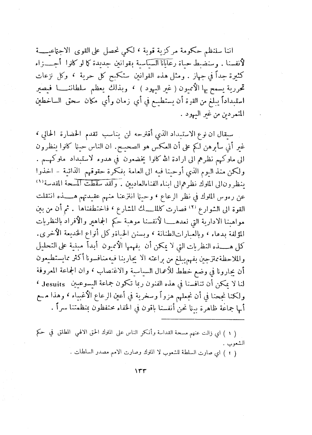 سيقال ان نوع الاستبداد الذي أقترحه لن يناسب تقدم الحضارة الحالي، غير أني سأبرهن لكم على أن العكس هو الصحيح. ان الناس حينما كانوا ينظرون إلى ملوكهم نظرهم إلى ارادة الله كانوا يخضعون في هدوء لاستبداد ملوكهم. ولكن منذ اليوم الذي أوحينا فيه إلى العامة بفكرة حقوقهم الذاتية ـ اخذوا ينظرون إلى الملوك نظرهم إلى أبناء الفناء العاديين. ولقد سقطت المسحة المقدسة (¬1) عن رؤوس الملوك في نظر الرعاع، وحينما انتزعنا منهم عقيدتهم هذه انتقلت القوة إلى الشوارع (¬2) فصارت كالملك المشارع، فاختطفناها. ثم أن من بين مواهبنا الادارية التي نعدها لأنفسنا موهبة حكم الجماهير والأفراد بالنظريات المؤلفة بدهاء، وبالعبارات الطنانة، وبسنن الحياة وبكل أنواع الخديعة الأخرى. كل هذه النظريات التي لا يمكن أن يفهمها الأمميون أبداً مبنية على التحليل والملاحظة ممتزجين بفهم يبلغ من براعته الا يجارينا فيه منافسونا أكثر مما يستطيعون أن يجارونا في وضع خطط للأعمال السياسية والاغتصاب، وأن الجماعة المعروفة لنا لا يمكن أن تنافسنا في هذه الفنون ربما تكون جماعة اليسوعيين Jesuits، ولكنا نجحنا في أن نجعلهم هزواً وسخرية في أعين الرعاع الأغبياء، وهذا مع أنها جماعة ظاهرة بينما نحن أنفسنا باقون في الخفاء محتفظون سراً.