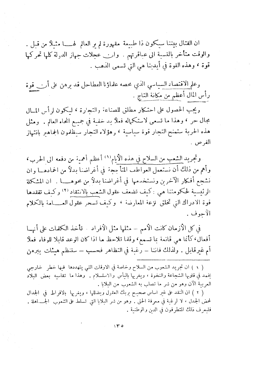 (¬1) ان تجريد الشعوب من السلاح وخاصة في الأوقات التي يتهددها فيها خطر خارجي يحمد في قلوبنا الشجاعة والنخوة، ويغريها باليأس والاستسلام. وهذا ما تقاسيه بعض البلاد العربية الآن وهو من شر ما تصاب به الشعوب من البلايا.