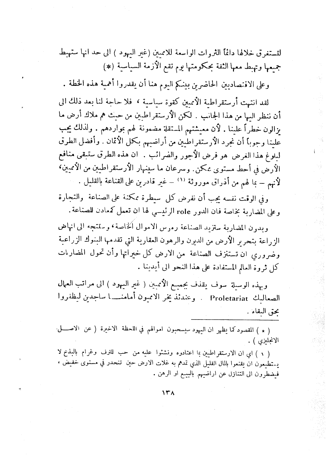 لقد انتهت أرستقراطية الأمميين كقوة سياسية، فلا حاجة لنا بعد ذلك إلى ان ننظر إليها من هذا الجانب. لكن الأرستقراطيين من حيث هم ملاك أرض ما يزالون خطراً علينا لان معيشتهم المستقلة مضمونة لهم بمواردهم. ولذلك يجب علينا وجوباً أن نجرد الأرستقراطيين من أراضيهم بكل الأثمان. وأفضل الطرق لبلوغ هذا الغرض هو فرض الأجور والضرائب. ان هذه الطرق ستبقى منافع الأرض في احط مستوى ممكن. . وسرعان ما سينهار الأرستقراطيين من الأميين، لأنهم ـ بما لهم من أذواق موروثة (¬2) ـ غير قادرين على القناعة بالقليل.