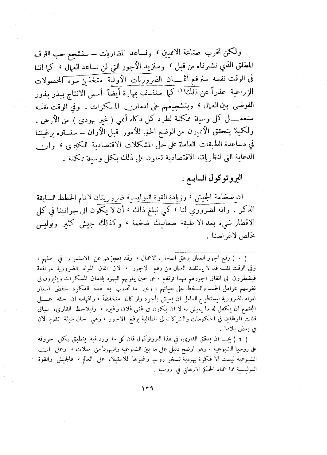 (¬1) رفع أجور العمال يرهق أصحاب الاعمال، وقد يعجزهم عن الاستمرار في عمله، وفي الوقت نفسه قد لا يسستفيد العمال من رفع الأجور، لأن اثمان المواد الضرورية مرتفعة فيضطرون إلى انفاق اجورهم مهما ترتفع، على حين يغريهم اليهود بادمان المسكرات ويثيرون في نفوسهم عوامل الحسد والسخط على حياتهم، وغير ما تحارب به هذه الفكرة خفض اسعار المواد الضرورية ليستطيع العامل ان يعيش بأجره ولو كان منخفضاً، وافهامه ان حقه على المجتمع ان يكفل له ما يعيش به لا ان يكون في غنى فلان وغيره، وليلاحظ القارئ سباق مئات الموظفين في الحكومات والشركات في المطالبة برفع الأجور، وهي حال سيئة تقوم الآن في بعض بلادنا.