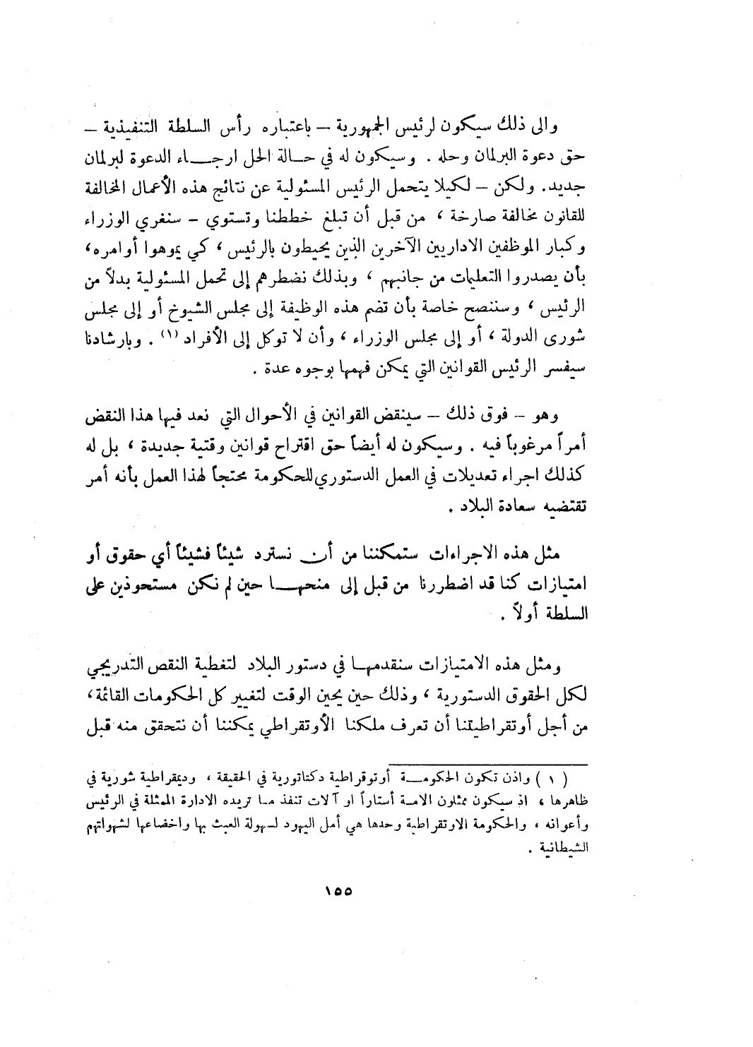 والى ذلك سيكون لرئيس الجمهورية ـ باعتباره رأس السلطة التنفيذية ـ حق دعوة البرلمان وحله. وسيكون له في حالة الحل ارجاء الدعوة لبرلمان جديد. ولكن ـ لكيلا يتحمل الرئيس المسؤولية عن نتائج هذه الأعمال المخالفة للقانون مخالفة صارخة، من قبل أن تبلغ خططنا وتستوي ـ سنغري الوزراء وكبار الموظفين الاداريين الآخرين الذين يحيطون بالرئيس، كي يموهوا أوامره، بأن يصدروا التعليمات من جانبهم، وبذلك نضطرهم إلى تحمل المسؤولية بدلاً من الرئيس، وسننصح خاصة بأن تضم هذه الوظيفة إلى مجلس الشيوخ أو إلى مجلس شورى الدولة، أو إلى مجلس الوزراء، وأن لا توكل إلى الأفراد (¬1). وبارشادنا سيفسر الرئيس القوانين التي يمكن فهمها بوجوه عدة.