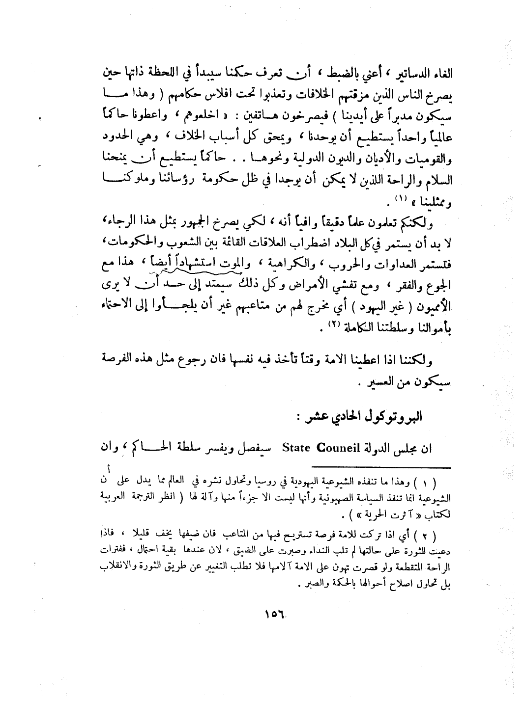 (¬1) وهذا ما تنفذه الشيوعية اليهودية في روسيا وتحاول نشره في العالم مما يدل على أن الشيوعية انما تنفذ السياسة الصهيونية وأنها ليست إلا جزءاً منها وآلة لها (انظر الترجمة العربية لكتاب "آثرت الحرية").