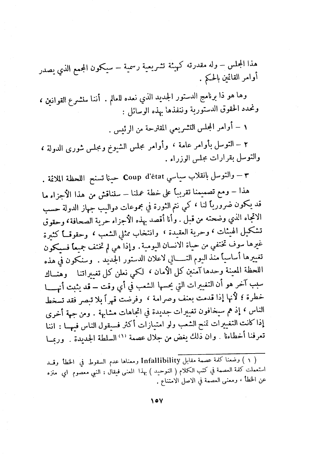 هذا ـ ومع تصميمنا تقريباً على خطة عملنا ـ سنناقش من هذه الأجزاء ما قد يكون ضرورياً لنا، كي نتم الثورة في مجموعات دواليب جهاز الدولة حسب الاتجاه الذي وضحته من قبل. وأنا أقصد بهذه الاجزاء حرية الصحافة، وحقوق تشكيل الهيئات، وحرية العقيدة، وانتخاب ممثلي الشعب، وحقوقاً كثيرة غيرها سوف تختفي من حياة الإنسان اليومية. واذا هي لم تختف جميعاً فسيكون تغييرها أساسياً منذ اليوم التالي لاعلان الدستور الجيد. وسنكون في هذه اللحظة المعينة وحدها آمنين كل الأمان، لكي نعلن كل تغييراتنا. وهناك سبب آخر هو أن التغييرات التي يحسها الشعب في أي وقت ـ قد يثبت أنها خطرة لأنها إذا قدمت بعنف وصرامة وفرضت قهراً بلا تبصر فقد تسخط الناس، إذ هم سيخافون تغييرات جديدة في اتجاهات مشابهة. ومن جهة أخرى إذا كانت التغييرات تمنح الشعب ولو امتيازات أكثر فسيقول الناس فيها: أننا تعرفنا أخطاءنا. وان ذلك يغض من جلال عصمة (¬1) السلطة الجديدة. وربما
