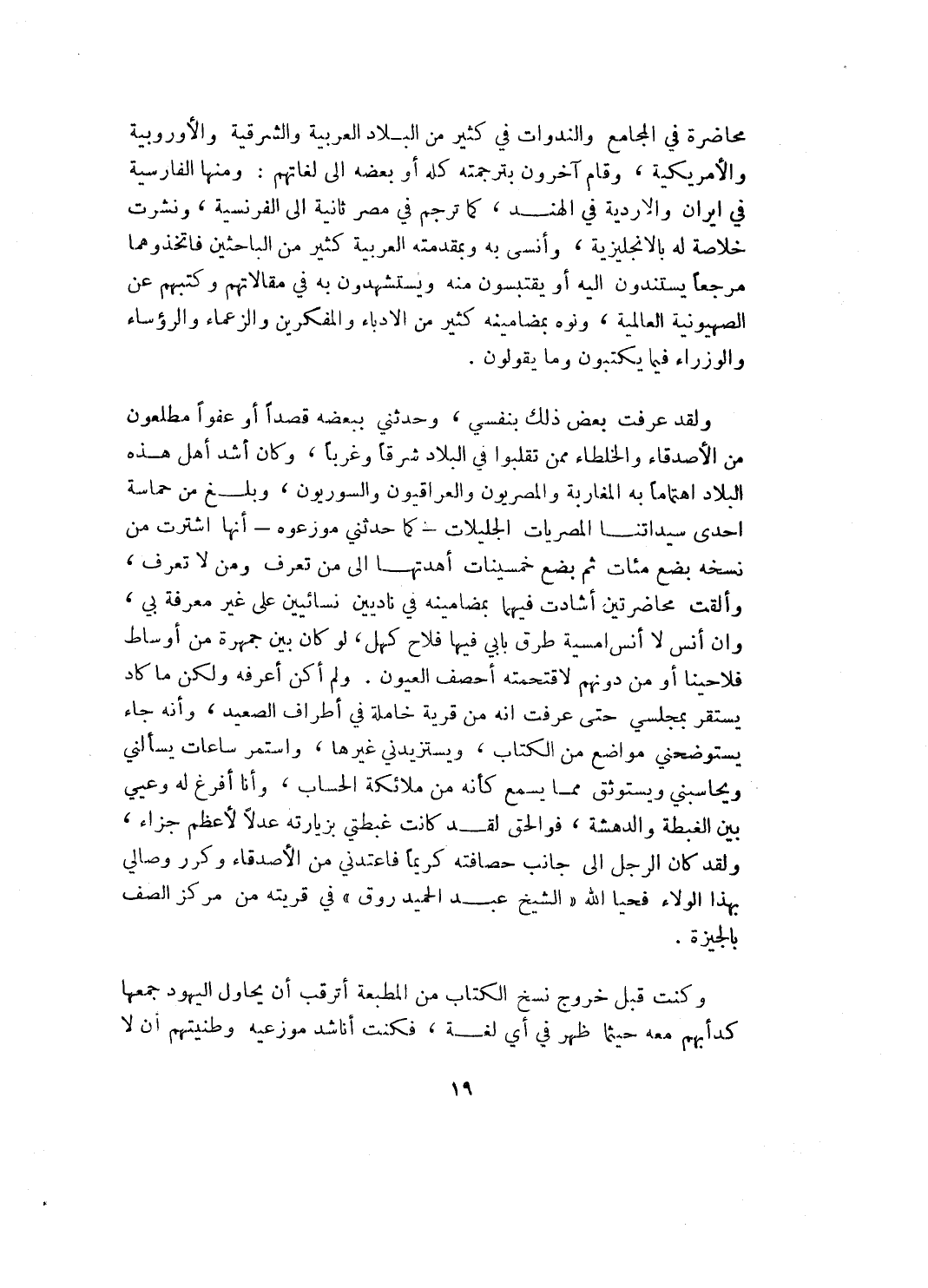 وكنت قبل خروج نسخ الكتاب من الطبعة أترقب أن يحاول اليهود جمعها كدأبهم معه حيثما ظهر في أي لغة، فكنت أناشد موزعيه وطنيتهم أن لا
