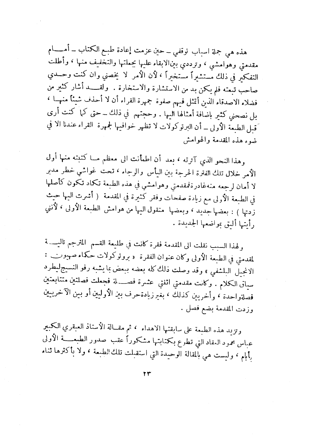 هذه هي جملة أسباب توقفي ت حين عزمت إعادة طبع الكتاب ـ أمام مقدمتي وهوامشي، وترددي بين الابقاء عليها بجملتها والتخفيف منها، وأطلت التفكير في ذلك مستشيراً مستخيراً، لأن الأمر لا يخصني وأن كنت وحدي صاحب تبعته فلم يكن بد من الاستشارة والاستخارة. ولقد أشار كثير من فضلاء الاصدقاء الذين أتمثل فيهم صفوة جمهرة القراء أن لا أحذف شيئاً منها، بل نصحني كثير باضافة أمثالها إليها. وحجتهم في ذلك ـ حتى كما كنت أرى قبل الطبعة الأولى ـ أن البروتوكولات لا تظهر خوافيها لجمهرة القراء عندنا الا في ضوء هذه المقدمة والهوامش.