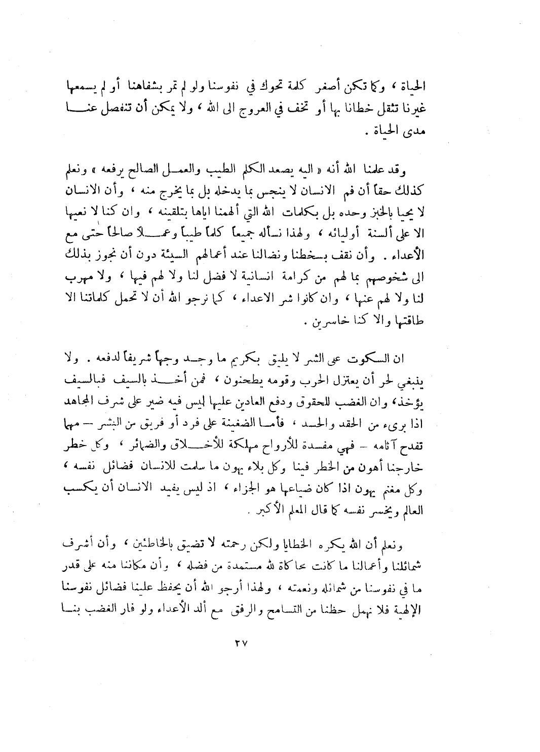 ان السكوت على الشر لا يليق بكريم ما وجد وجهاً شريفاً لدفعه. ولا ينبغي لحر أن يعتزل الحرب وقومه يطحنون، فمن أخذ بالسيف فبالسيف يؤخذ، وأن الغضب للحقوق ودفع العادين عليها ليس فيه ضير على شرف المجاهد إذا برئ من الحقد والحسد، فأما الضغينة على فرد أو فريق من البشر ـ مهما تفدح آثامه ـ فهي مفسدة للأرواح مهلكة للأخلاق والضمائر، وكل خطر خارجنا أهون من الخطر فينا وكل بلاء يهون ما سلمت للانسان فضائل نفسه، وكل مغنم يهون إذا كان ضياعها هو الجزاء، إذ ليس يفيد الإنسان أن يكسب العالم ويخسر نفسه كما قال المعلم الأكبر.