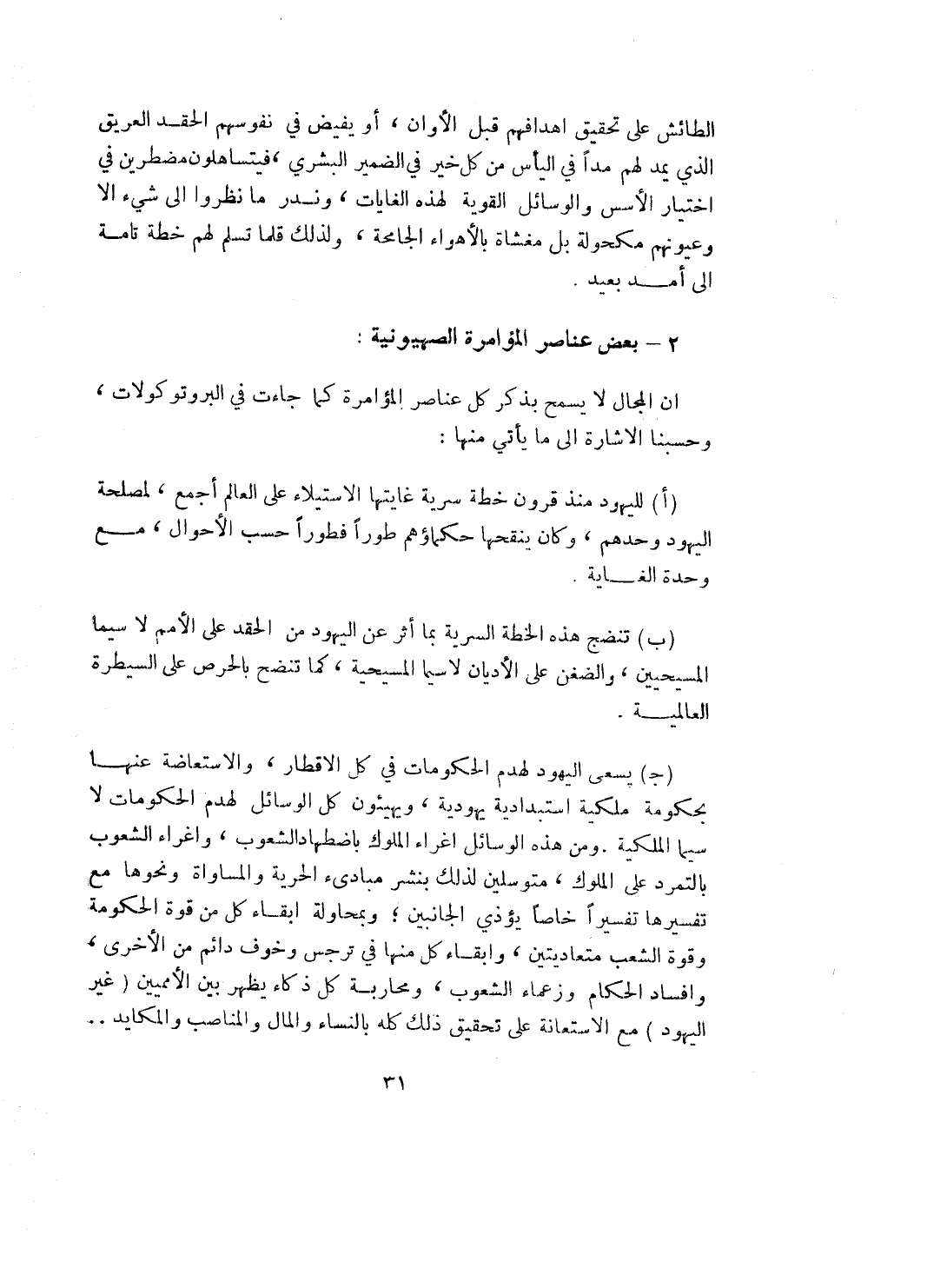 (أ) لليهود منذ قرون خطة سرية غايتها الاستيلاء على العالم أجمع، لمصلحة اليهود وحدهم، وكان ينقحها حكماؤهم طوراً فطوراً حسب الأحوال، مع وحدة الغاية.