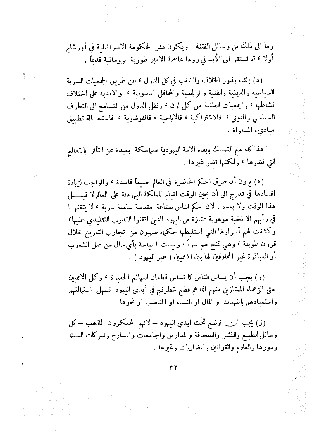(ز) يجب أن توضع تحت ايدي اليهود ـ لأنهم المحتكرون للذهب ـ كل وسائل الطبع والنشر والصحافة والمدارس والجامعات والمسارح وشركات السينما ودورها والعلوم والقوانين والمضاربات وغيرها.