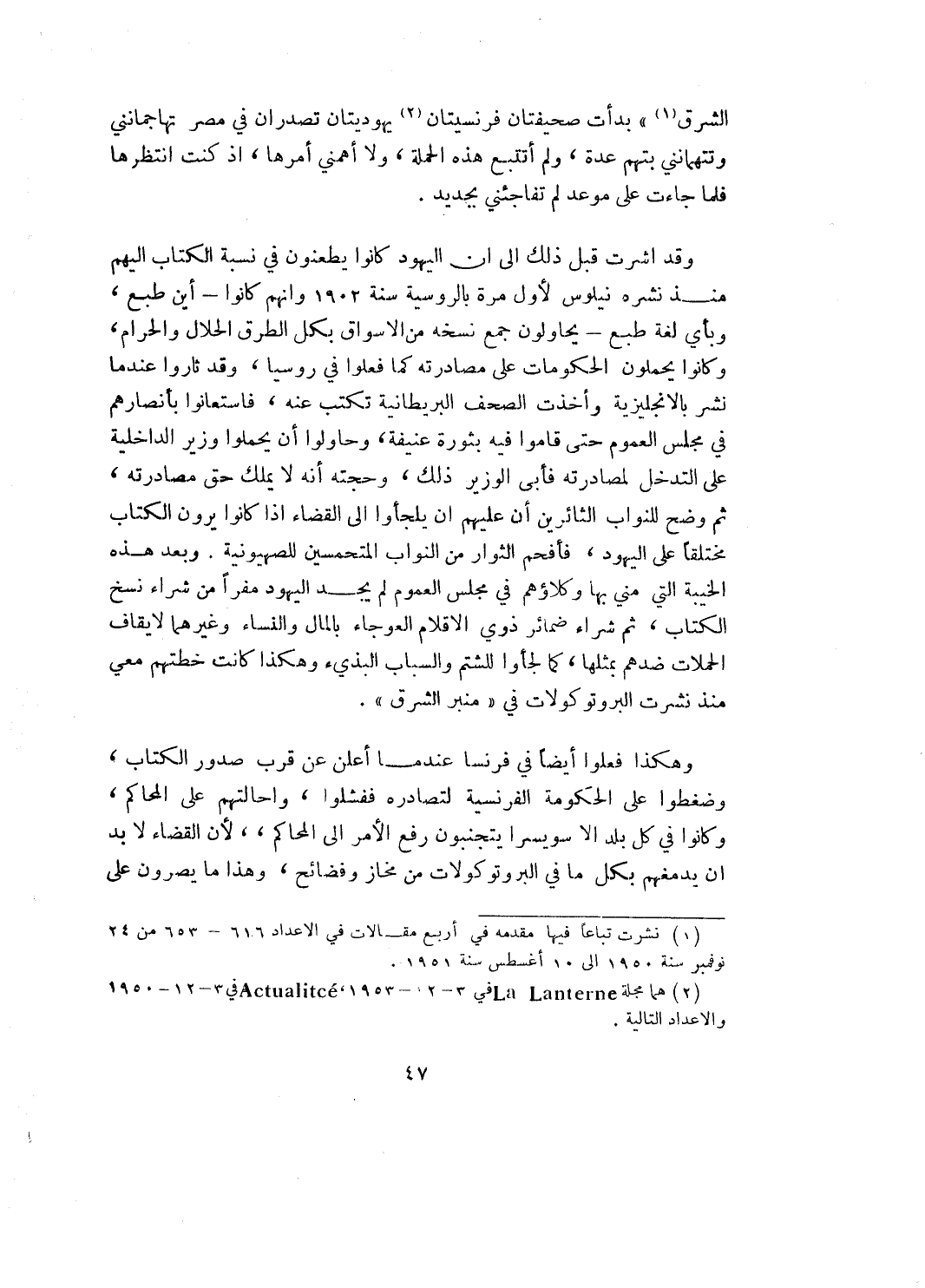 وقد اشرت قبل ذلك إلى أن اليهود كانوا يطعنون في نسبة الكتاب اليهم منذ نشره نيلوس لأول مرة بالروسية سنة 1902 وانهم كانوا ـ أين طبع، وبأي لغة طبع ـ يحاولون جمع نسخه من الأسواق بكل الطرق الحلال والحرام، وكانوا يحملون الحكومات على مصادرته فأبى الوزير ذلك، وحجته أنه لا يملك حق مصادرته، ثم وضح للنواب الثائرين أن عليهم ان يلجأوا إلى القضاء اذا كانوا يرون الكتاب مختلقاً على اليهود، فأفحم الثوار من النواب المتحمسين للصهيونية. بعد هذه الخيبة التي مني بها وكلاؤهم في مجلس العموم لم يجد اليهود مفراً من شراء نسخ الكتاب، ثم شراء ضمائر ذوي الاقلام العوجاء بالمال والنساء وغيرهما لايقاف الحملات ضدهم بمثلها، كما لجأوا للشتم والسباب البذيء وهكذا كانت خطتهم معي منذ نشرت البروتوكولات في "منبر الشرق".