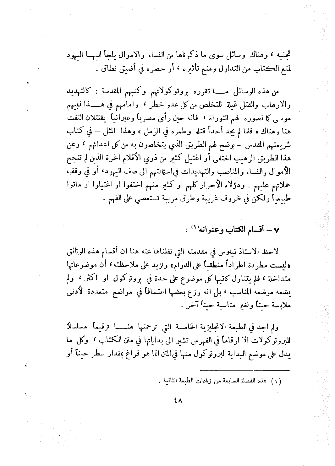 ولم اجد في الطبعة الانجليزية الخامسة التي ترجمتها هنا ترقيماً مسلسلاً للبروتوكولات الا ارقاماً في الفهرس تشير إلى بدايتها في متن الكتاب، وكل ما يدل على موضع البداية لبروتوكول منها في المتن انما هو فراغ بمقدار سطر حيناً أو