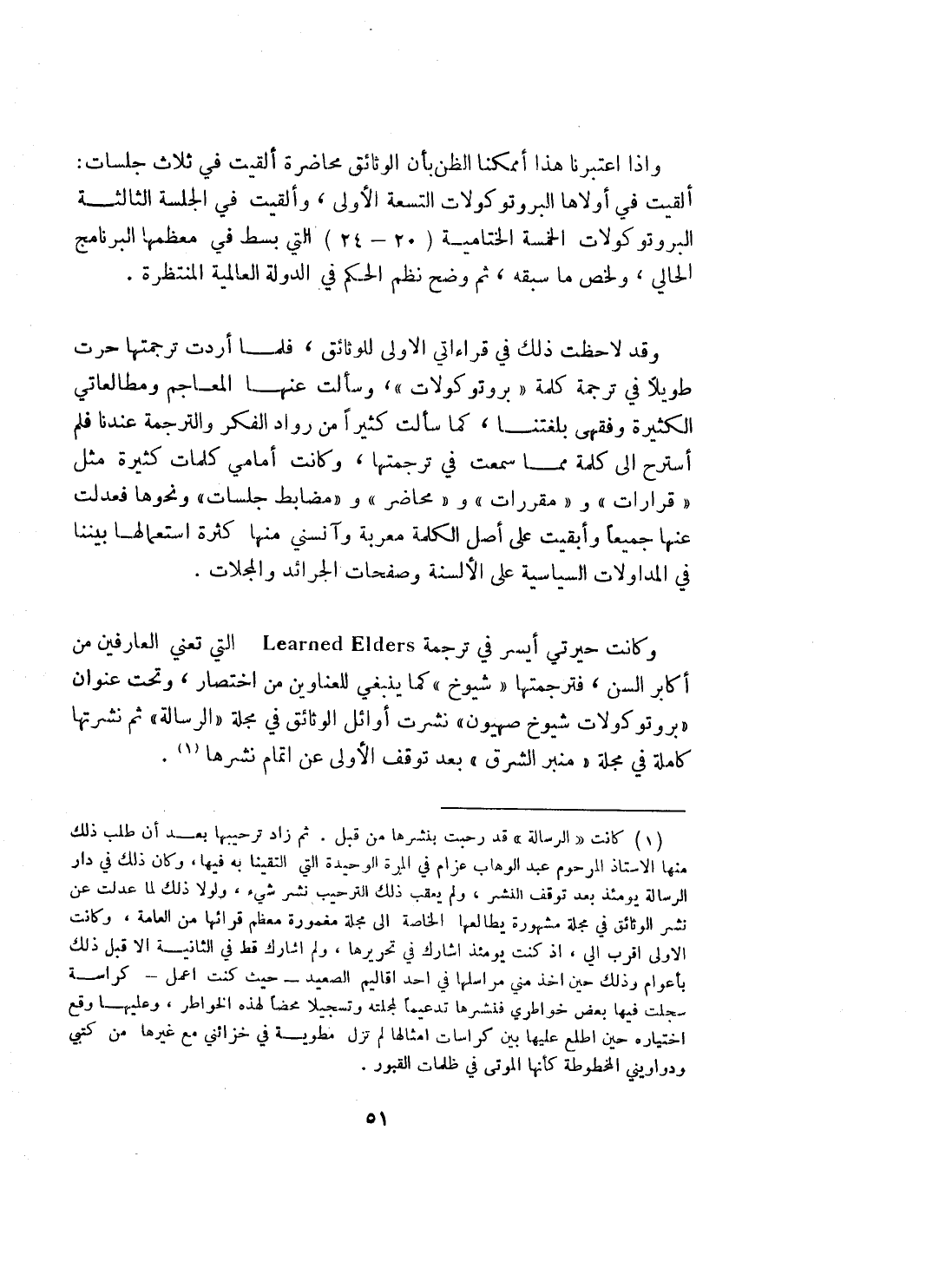 وكانت حيرتي ايسر في ترجمة Learned Elders التي تعني العارفين من أكابر السن، فترجمتها "شيوخ" كما ينبغي للعناوين من اختصار، وتحت عنوان"بروتوكولات شيوخ صهيون" نشرت أوائل الوثائق في مجلة "الرسالة" ثم نشرتها كاملة في مجلة "منبر الشرق" بعد توقف الأولى عن اتمام نشرها (¬1).