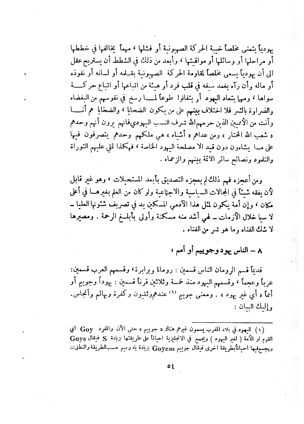 (¬1) اليهود في بلاد المغرب يسمون غيرهم هناك "جوييم"حتى الآن والمفرد Goy أي القوم أو الأمة (لغير اليهود) ويجمع في الانجليزية احياناً على طريقتها بزيادة S فيقال Goys ويجمع فيها احياناً بطريقة أخرى فيقال جوييم Goyem بزيادة ياء وميم حسب الطريقة والنطق الغربيين كما يجمع الاسم في العربية جمع مذكر سالماً بزيادة ياء ونون فيقال معلم ومعلمين أو بزيادة ميم في الجمع على صيغة المفرد مع الضمائر فيقال: عليك وعليكم وقد وضعنا كلمة أمم وأمميين وأممي مقابل كلمة Gentiles ( أي الجوييم) أتباعاً لمترجمي العهدين القديم والجديد إلى العربية، ويراد بها غير اليهود، وأرى أن كلمة أميين القرآنية (انظر الآية القرآنية ص58) تؤدى معنى جوييم و gentiles خير اداء، ولكننا وجدناها كلمة مشتركة قليلة التداول بهذا المعنى في كتابتنا المعاصرة فتركناها هنا.