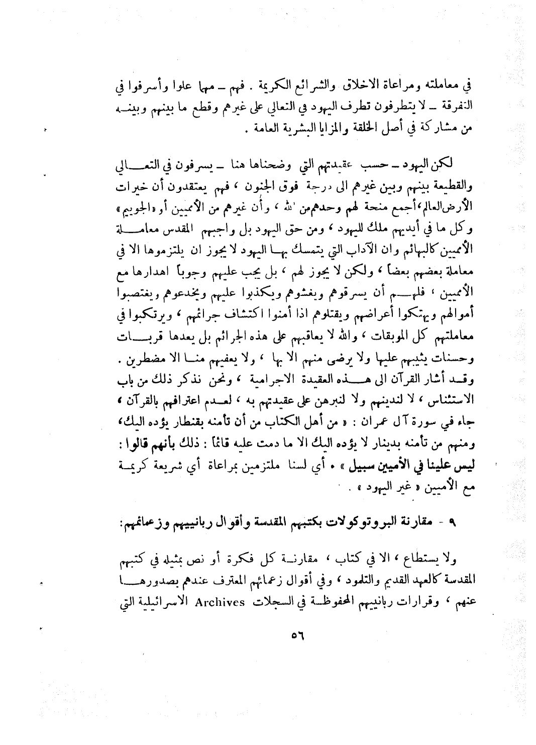 ولا يستطاع، الا في كتاب، مقارنة كل فكرة أو نص بمثيله في كتبهم المقدسة كالعهد القديم والتلمود، وفي أقوال زعمائهم المعترف عندهم بصدورها عنهم، وقرارات ربانييهم المحفظة في السجلات Archives الإسرائيلية التي