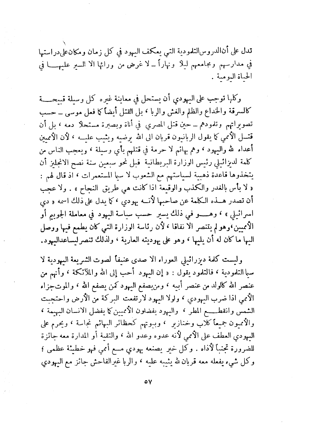 وكلها توجب على اليهودي ان يستحل في معاينة غيره كل وسيلة قبيحة كالسرقة والخداع والظلم والغش والربا، بل القتل أيضاً كما فعل موسى ـ حسب تصويراتهم وتلمودهم ـ حين قتل المصريفي أناة وبصبرة مستحلاً دمه، بل أن قتل الأممي كما يقول الربانيون قربان الى الله يرضيه ويثيب عليه، لأن الأمميين أعداء لله واليهود، وهم بهائم لا حرمة في قتلهم بأي وسيلة، ويعجب الناس من كلمة لديزائيلي رئيس الوزارة البريطانية قبل نحو سبعين سنة نصح الانجليز أن يتخذوها قاعدة ذهبية لسياستهم مع الشعوب لا سيما المستعمرات، إذ قال لهم: "لا بأس بالغدر والكذب والوقيعة اذا كانت هي طريق النجاح". ولا عجب أن تصدر هذه الكلمة عن صاحبها لأنه يهودي، كما يدل على ذلك اسمه" دي اسرائيلي"،وهو في ذلك يسير حسب سياسة اليهود في معاملة الجوييم أو الأمميين، وهو لم يتنصر الا نفاقاً، لأن رئاسة الوزارة التي كان يطمع فيها ووصل إليها ما ان له أن يليها، وهو على يهوديته العارية، ولذلك تنصر ليساعد اليهود.