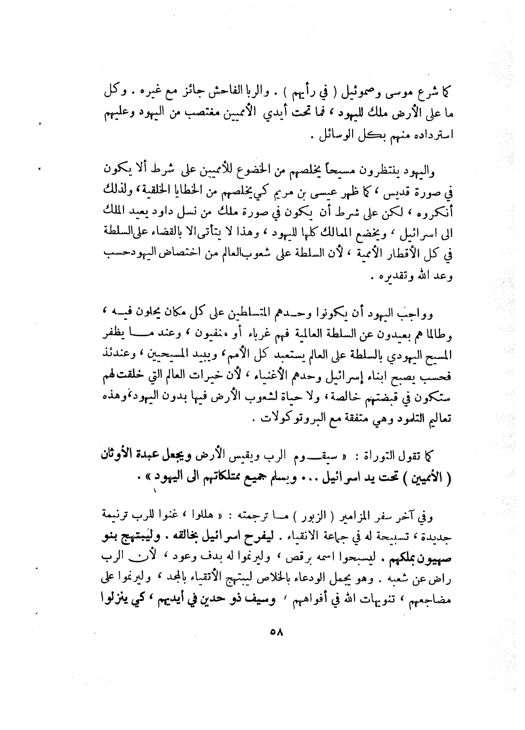 واليهود ينتظرون مسيحاً يخلصهم من الخضوع للأميين على شرط الا يكون في صورة قديس، كما ظهر عيسى بن مريم كي يخلصهم من الخطايا الخلقية، ولذلك أنكروه، لكن على شرط أن يكون في صورة ملك من نسل داود يعيد الملك إلى اسرائيل، ويخضع الممالك كلها لليهود، وهذا لا يتأتى الا بالقضاء على السلطة في كل الأقطار الأممية، لان السلطة على شعوب العالم من اختصاص اليهود حسب وعد الله وتقديره.