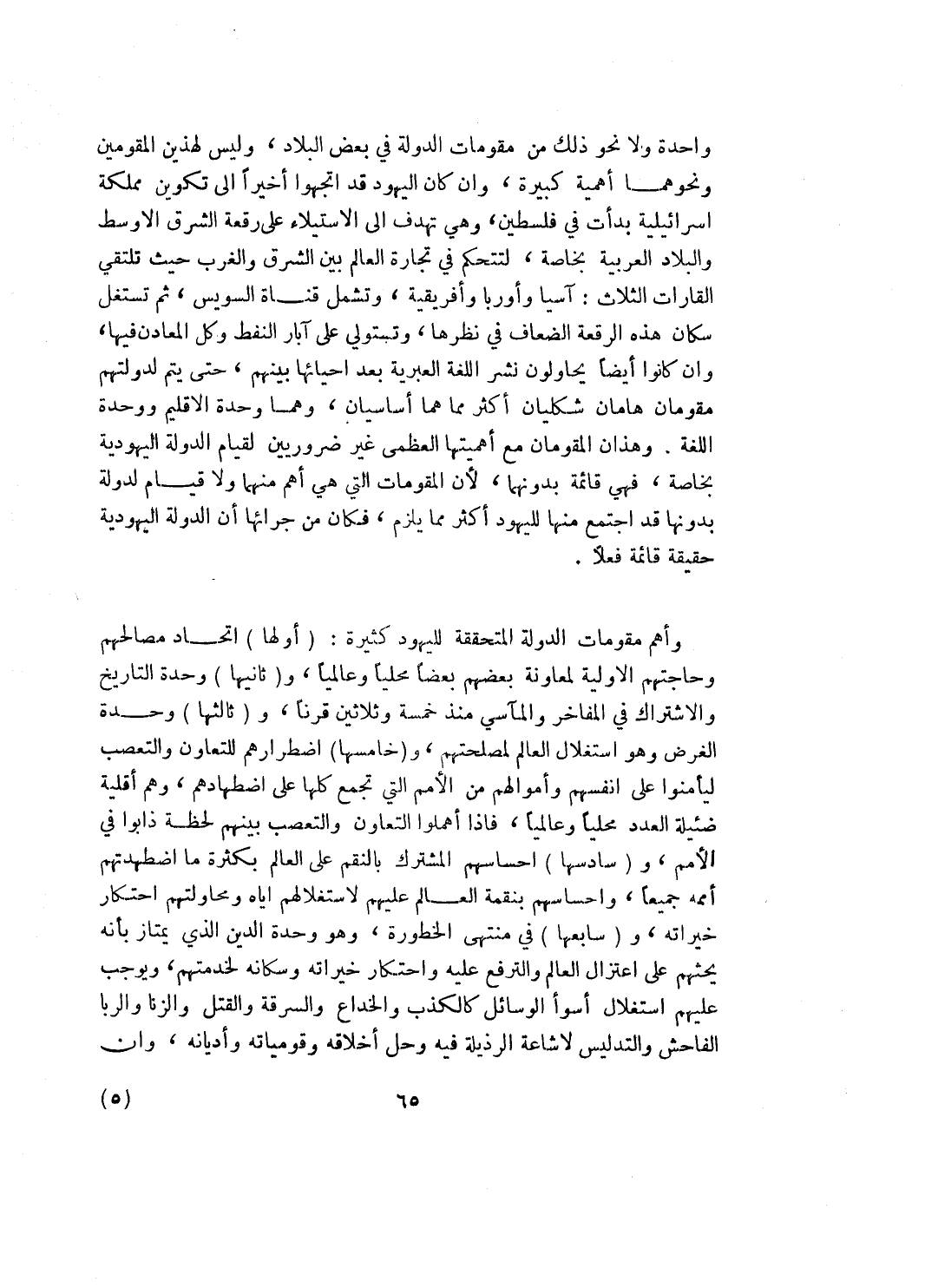 واحدة ولا نحو ذلك من مقومات الدولة في بعض البلاد، وليس لهذين المقومين ونحوهما اهمية كبيرة، وان كان اليهود قد اتجهوا أخيراً إلى تكوين مملكة اسرائيلية بدأت في فلسطين، وهي تهدف إلى الاستيلاء على رقعة الشرق الأوسط والبلاد العربية بخاصة، لتتحكم في تجارة العالم بين الشرق والغرب حيث تلتقي القارات الثلاث: آسيا وأوروبا وأفريقية، وتشمل قناة السويس، ثم تستغل سكان هذه الرقعة الضعاف في نظرها، وتستولي على آبار النفط وكل المعادن فيها، وان كانوا ايضاً يحاولون نشر اللغة العبرية بعد أحيائها بينهم، حتى يتم لدولتهم مقومان هامان شكليان أكثر مما هما أساسيان، وهما وحدة الإقليم ووحدة اللغة. وهذان المقومان مع أهميتهما العظمى غير ضروريين لقيام الدولة اليهودية بخاصة، فهي قائمة بدونهما، لان المقومات التي هي أهم منهما ولا قيام لدولة بدونهما قد اجتمع منها لليهود أكثر مما يلزم، فكان من جرائها أن الدولة اليهودية حقيقة قائمة فعلاً.