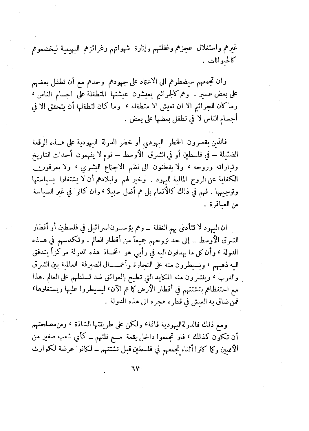 فالذين يقصرون الخطر اليهودي أو خطر الدولة اليهودية على هذه الرقعة الضئيلة ـ في فلسطين أو في الشرق الأوسط ـ قوم لا يفهمون أحداث التاريخ وتياراته وروحه، ولا يفطنون إلى نظم الاجتماع البشري، ولا يعرفون الكفاية عن الروح المالية لليهود. وخير لهم ولبلادهم أن لا يشتغلوا بسياستها وتوجيهها. فهم في ذلك كالأنعام بل هم أضل سبيلاً، وان كانوا في غير السياسة من العباقرة.