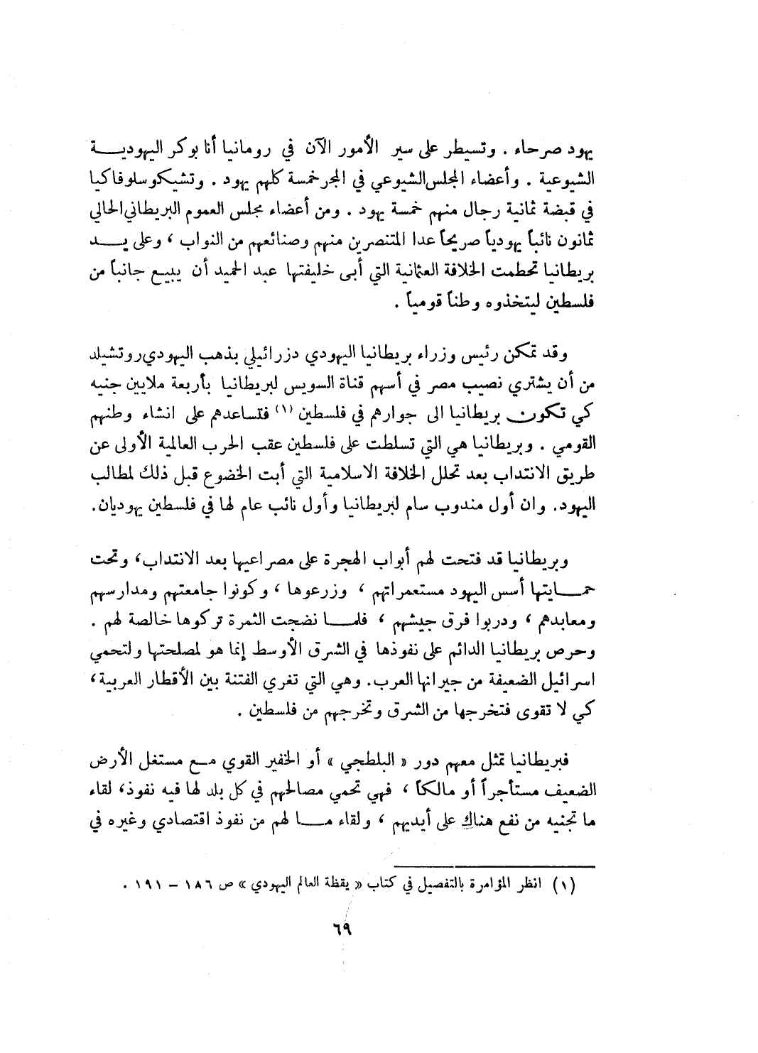 وتسيطر على سير الأمور الآن في رومانيا أنا بوكر اليهودية الشيوعية. وأعضاء المجلس الشيوعي في المجر خمسة كلهم يهود. وتشيكوسلوفاكيا في قبضة ثمانية رجال منهم خمسة يهود. ومن اعضاء مجلس العموم البريطاني الحالي ثمانون نائباً يهودياً صريحاً عدا المتنصرين منهم وصنائعهم من النواب، وعلى يد بريطانيا تحطمت الخلافة العثمانية التي أبى خليفتها عبد الحميد أن يبيع جانباً من فلسطين ليتخذوه وطناً قومياً.