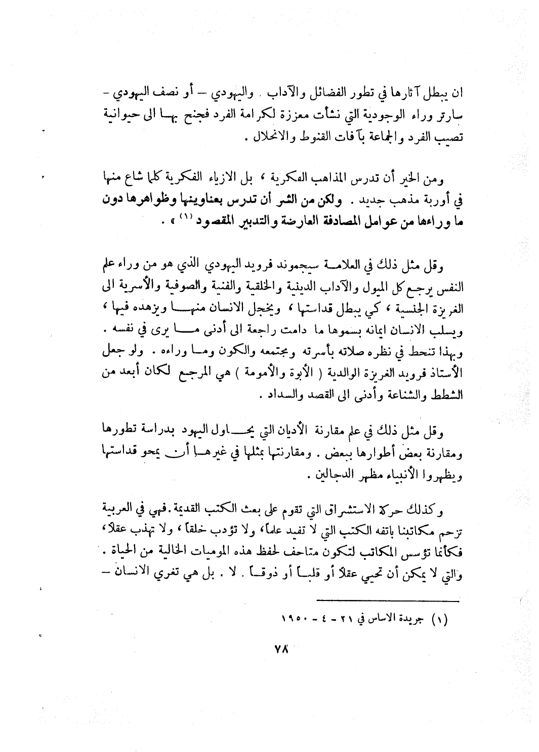 أن يبطل آثارها في تطور الفضائل والآداب. واليهودي ـ أو نصف اليهودي ـ سارتر وراء الوجودية التي نشأت معززة لكرامة الفرد فجنح بها إلى حيوانية تصيب الفرد والجماعة بآفات القنوط والانحلال.