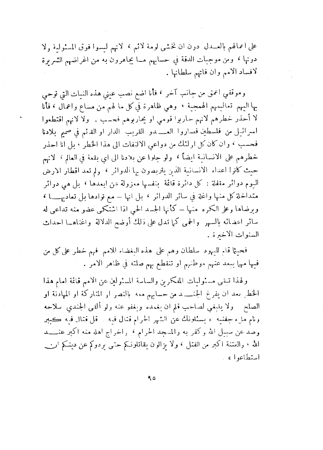 وموقفي اعمق من جانب آخر، فأنا اضع نصب عيني هذه النيات التي تؤحي بها إليهم تعاليمهم الهمجية، وهي ظاهرة في كل ما لهم من مساع واعمال، فأنا لا احذر خطرهم لأنهم حاربوا قومي أو يحاربوهم فحسب. ولا لأنهم اقتطعوا إسرائيل من فلسطين فصاروا العدو القريب الدار أو القائم في صميم بلادنا فحسب، وان كان كل اولئك من دواعي الالتفات إلى هذا الخطر، بل أنا احذر خطرهم على الانسانية ايضاً، ولو جلوا عن بلادنا إلى أي بقعة في العالم، لأنهم حيث كانوا أعداء الانسانية الذين يتربصون بها الدوائر، ولم تعد اقطار الأرض اليهم دوائر مقفلة: كل دائرة قائمة بنفسها معزولة عن ابعدها، بل هي دوائر متداخلة كل منها واغلة في سائر الدوائر، بل انها ـ مع توادها بل تعاديها، وبرضاها وعلى الكره منها ـ كأنها الجسد الحي إذا اشتكى عضو منه تداعى له سائر اعضائه بالسهر والحمى كما تدل على ذلك أوضح الدلالة واغناها احداث السنوات الأخيرة.