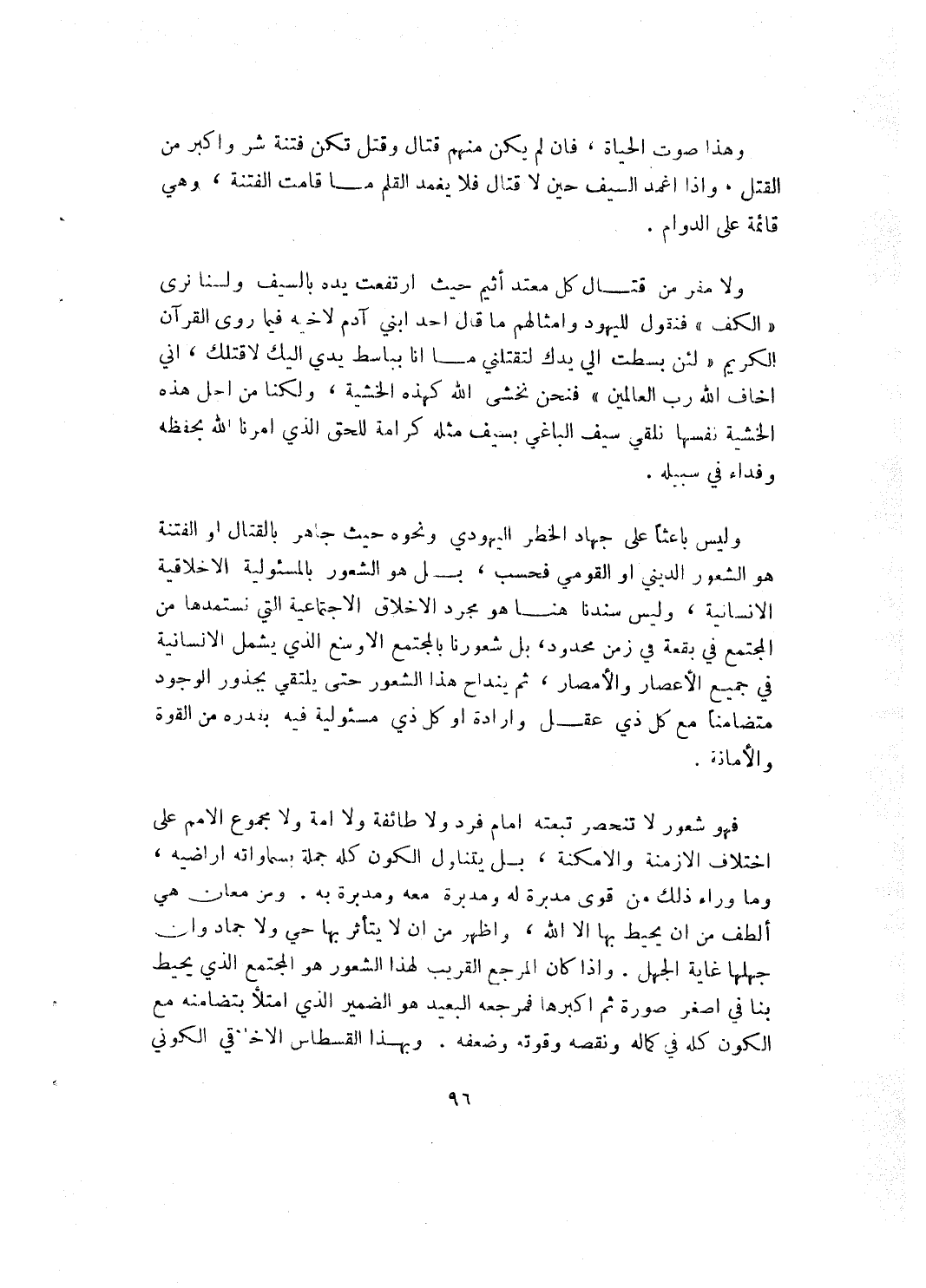 وليس باعثاً على جهاد الخطر اليهودي ونحوه حيث جاهر بالقتال أو الفتنة هو الشعور الديني أو القومي فحسب، بل هو الشعور بالمسؤولية الاخلاقية الانسانية، وليس سندنا هنا هو مجرد الاخلاق الاجتماعية التي نستمدها من المجتمع في بقعة في زمن محدود، بل شعورنا بالمجتمع الاوسع الي يشمل الانسانية في جميع الإعصار والأمصار، ثم ينداح هذا الشعور حتى يلتقي بجذور الوجود متضامنا مع كل ذي عقل وإرادة أو كل ذي مسؤولية فيه بقدرة من القوة والأمانة.