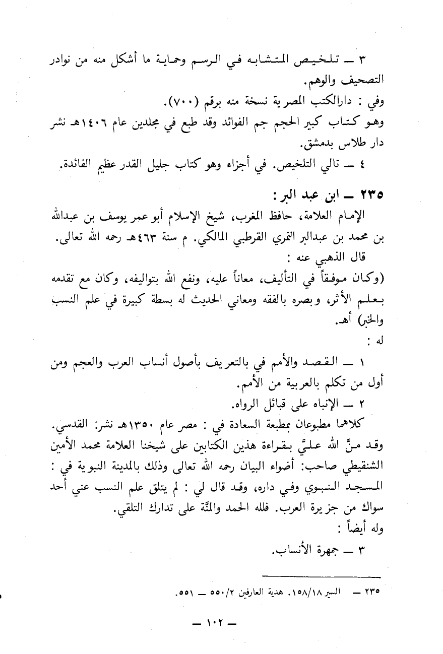4 - تالي التلخيص. في أجزاء وهو كتاب جليل القدر عظيم الفائدة 235 - ابن عبد البر: الإمام العلامة، حافظ المغرب، شيخ الإسلام أبو عمر يوسفبن عبد الله بن محمد بن عبد البر النمري القرطبي المالكي. م سنة 463 هـ رحمه الله تعالى.