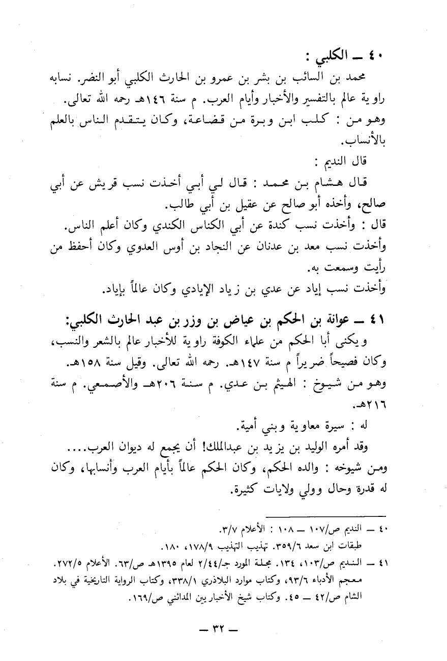 محمد بن السائب بن بشر بن عمرو بن الحارث الكلبي أبو النضر. نسابه رواية عالم بالتفسير والأخبار أيام العرب. م سنة 146 هـ رحمه الله تعالى.