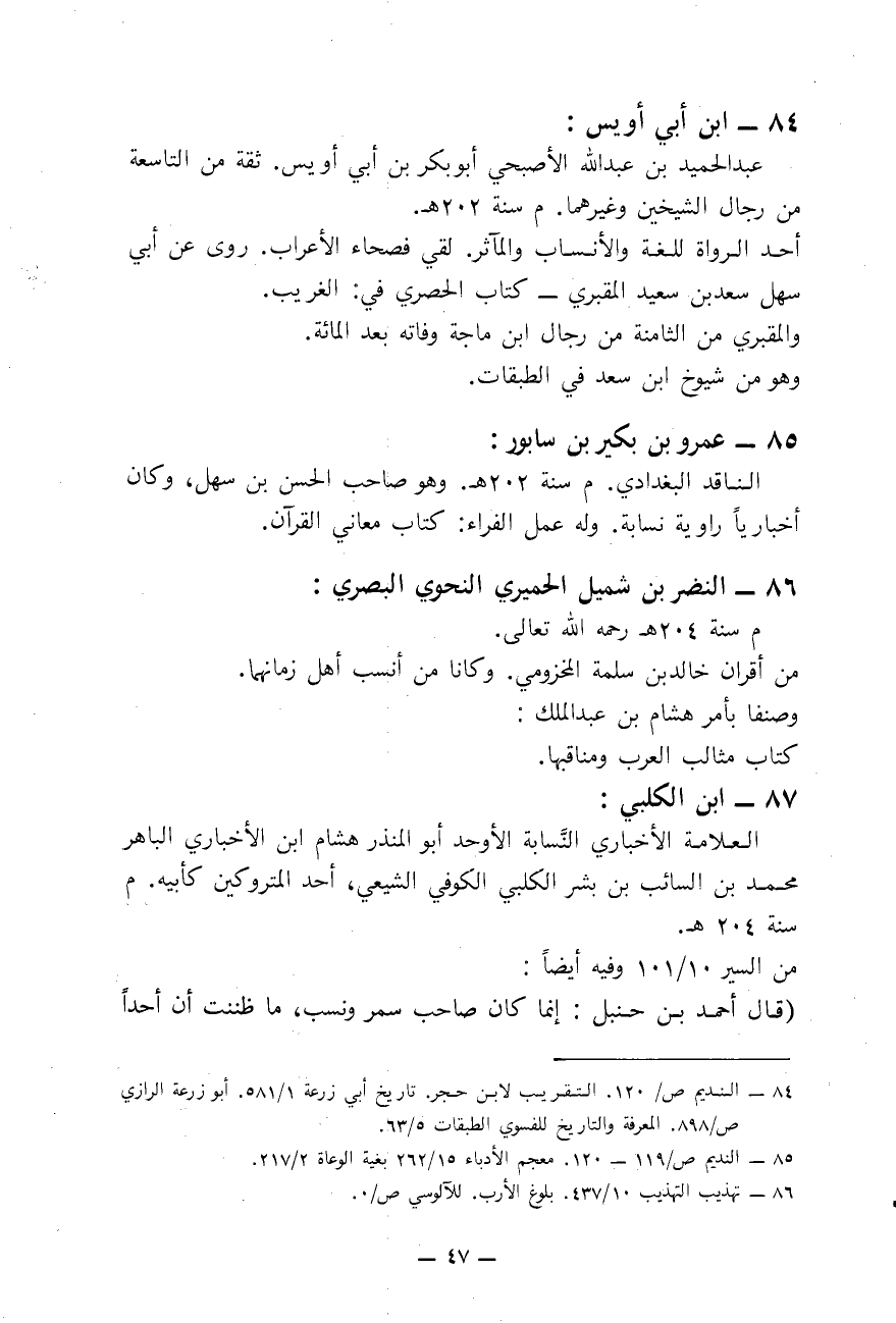 العلامة الأخباري النسابة الأوحد أبو المنذر هشام ابن الأخباري الباهر محمد بن السائب بن بشر الكلبي الكوفي الشيعي، أحد المتروكين كأبيه. م سنة 204 هـ.