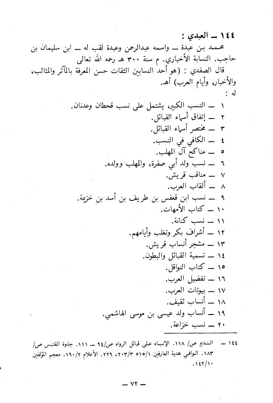 محمد بن عبدة واسمه عبد الرحمن وعبدة لقب له ابن سليمان بن حاجب. النسابة الأخباري. م سنة 300هـ رحمه الله تعالى قال الصفدي: " هو أحد النسابين الثقات حسن المعرفة بالمآثر والمثالب، والأخبار، وأيام العرب " أه.