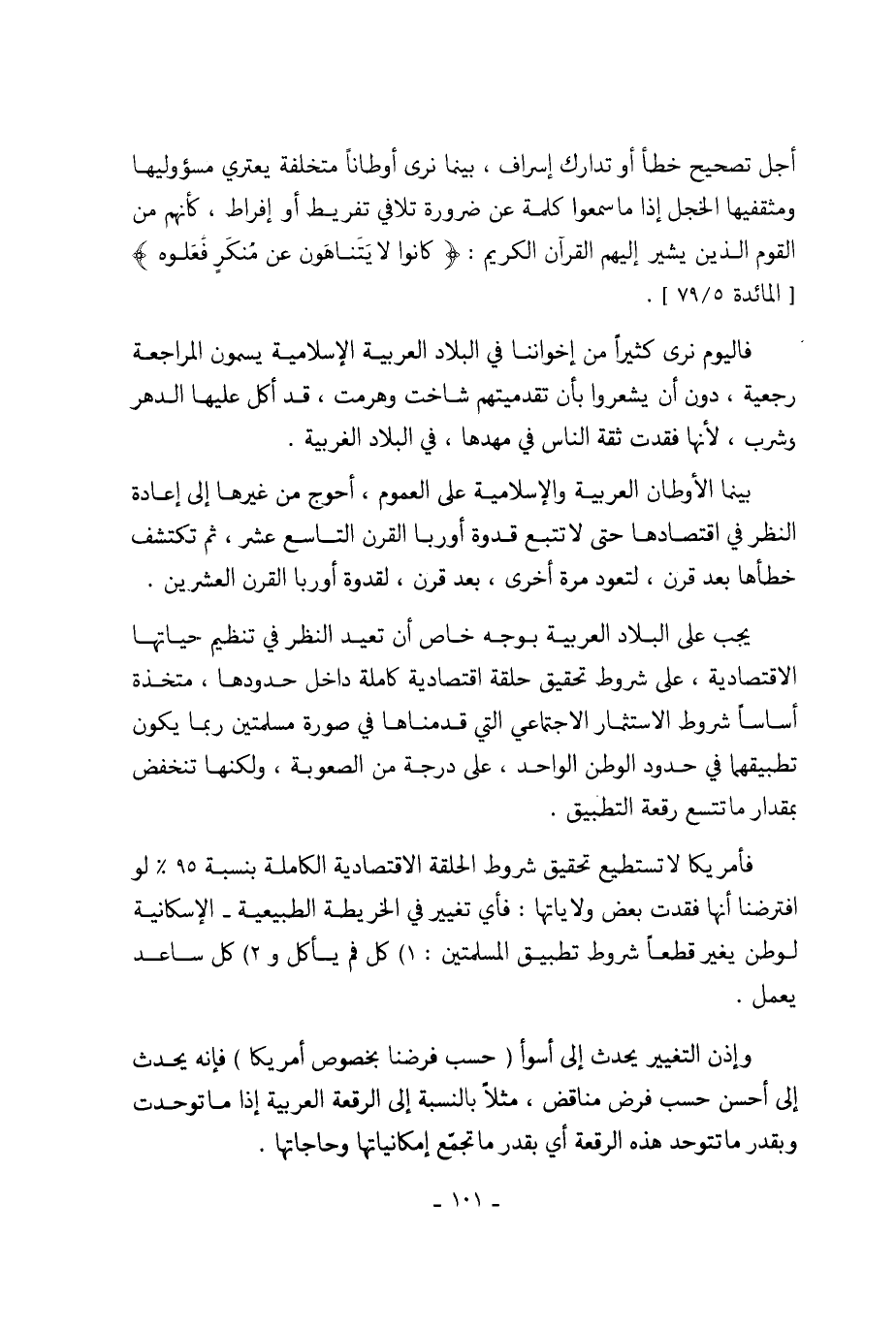 يجب على البلاد العربية بوجه خاص أن تعيد النظر في تنظيم حياتها الاقتصادية، على شروط تحقيق حلقة اقتصادية كاملة داخل حدودها، متخذة أساساً شروط الاستثمار الاجتماعي التي قدمناها في صورة مسلمتين ربما يكون تطبيقهما في حدود الوطن الواحد، على درجة من الصعوبة، ولكنها تنخفض بمقدار ما تتسع رقعة التطبيق.