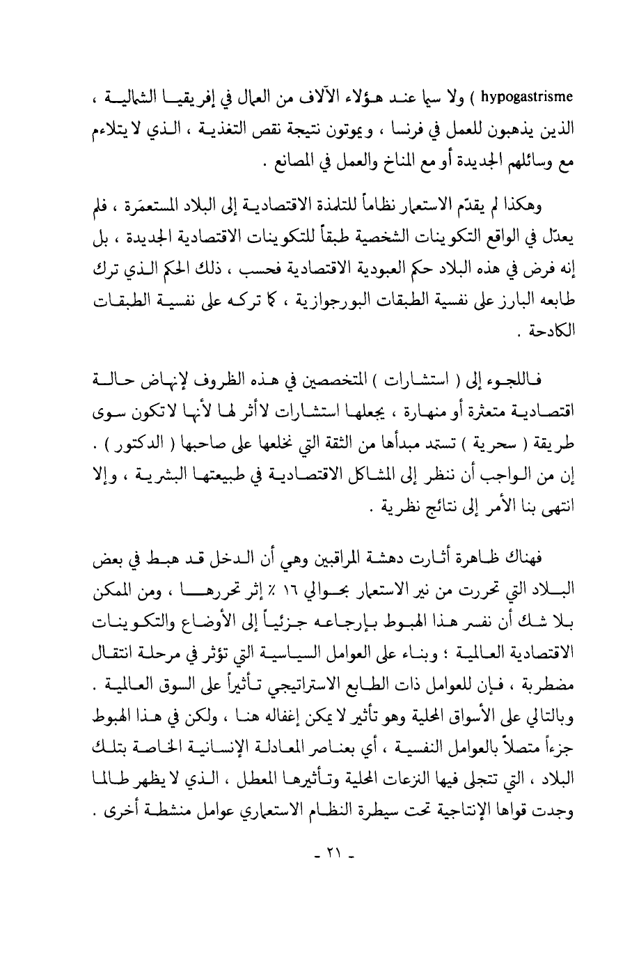 وهكذا لم يقدّم الاستعمار نظاماً للتلمذة الاقتصادية إلى البلاد المستعمَرة، فلم يعدّل في الواقع التكوينات الشخصية طبقاً للتكوينات الاقتصادية الجديدة، بل إنه فرض في هذه البلاد حكم العبودية الاقتصادية فحسب، ذلك الحكم الذي ترك طابعه البارز على نفسية الطبقات البورجوازية، كما تركه على نفسية الطبقات الكادحة.
