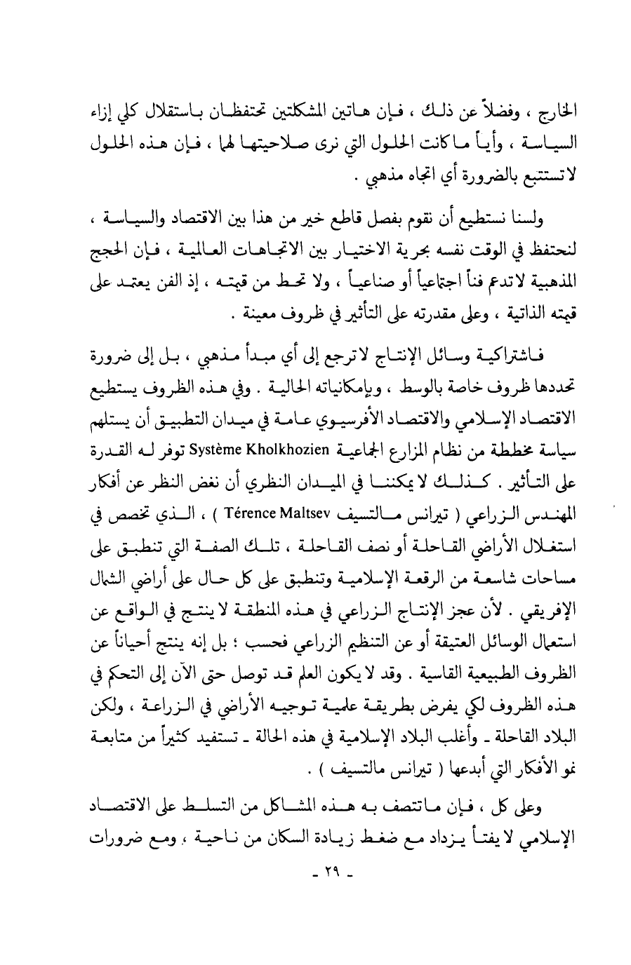 فاشتراكية وسائل الإنتاج لا ترجع إلى أي مبدأ مذهبي، بل إلى ضرورة تحددها ظروف خاصة بالوسط، وبإمكانياته الحالية. وفي هذه الظروف يستطيع الاقتصاد الإسلامي والاقتصاد الأفرسيوي عامة في ميدان التطبيق أن يستلهم سياسة مخططة من نظام المزارع الحماعية Système Kholkhozien توفر له القدرة على التأثير. كذلك لا يمكننا في الميدان النظري أن نغض النظر عن أفكار المهندس الزراعي (تيرانس مالتسيف Térence Maltsev)، الذي تخصص في استغلال الأراضي القاحلة أو نصف القاحلة، تلك الصفة التي تنطبق على مساحات شاسعة من الرقعة الإسلامية وتنطبق على كل حال على أراضي الشمال الإفريقي. لأن عجز الإنتاج الزراعي في هذه المنطقة لا ينتج في الواقع عن استعمال الوسائل العتيقة أو عن التنظيم الزراعي فحسب؛ بل إنه ينتج أحياناً عن الظروف الطبيعية القاسية. وقد لا يكون العلم قد توصل حتى الآن إلى التحكم في هذه الظروف لكي يفرض بطريقة علمية توجيه الأراضي في الزراعة، ولكن البلاد القاحلة- وأغلب البلاد الإسلامية في هذه الحالة- تستفيد كثيراً من متابعة نمو الأفكار التي أبدعها (تيرانس مالتسيف).