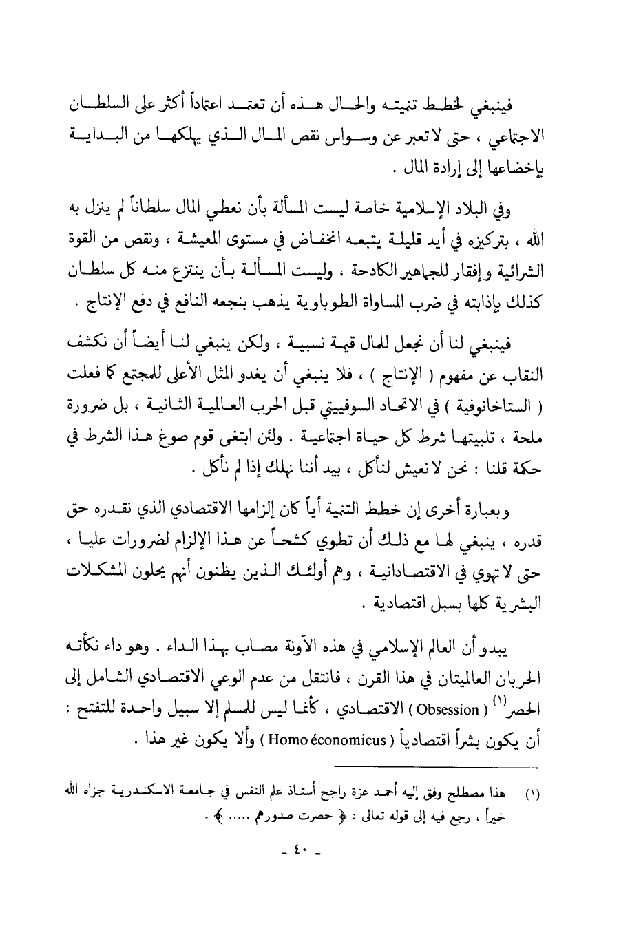 وفي البلاد الإسلامية خاصة ليست المسألة بأن نعطي المال سلطاناً لم ينزل به الله، بتركيزه في أيد قليلة يتبعه انخفاض في مستوى المعيشة، ونقص من القوة الشرائية وإفقار للجماهير الكادحة، وليست المسألة بأن ينتزع منه كل سلطان كذلك بإذابته في ضرب المساواة الطوباوية يذهب بنجعه النافع في دفع الإنتاج.