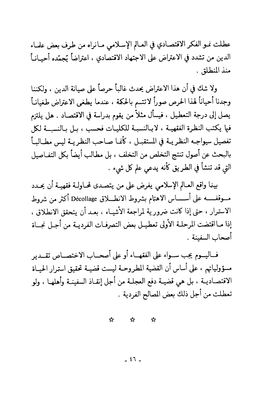 بينما واقع العالم الإسلامي يفرض على من يتصدى لمحاولة فقهية أن يحدد موقفه على أساس الاهتمام بشروط الانطلاق Décollage أكثر من شروط الاستمرار، حتى إذا كانت ضرورية لمراجعة الأشياء، بعد أن يتحقق الانطلاق، إذا ما اقتضت المرحلة الأولى تعطيل بعض التصرفات الفردية من أجل نجاة أصحاب السفينة.