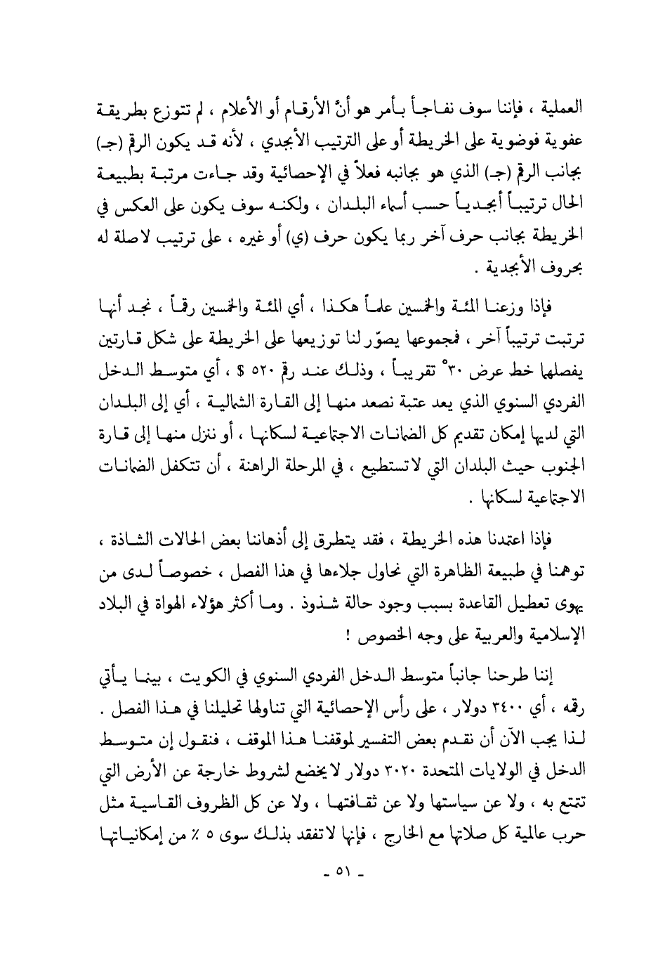 فإذا وزعنا المئة والخمسين علماً هكذا، أي المئة والخمسين رقماً، نجد أنها ترتبت ترتيباً آخر، فمجموعها يصوّر لنا توزيعها على الخريطة على شكل قارتين يفصلهما خط عرض 30° تقريباً، وذلك عند رقم 520 $، أي متوسط الدخل الفردي السنوي الذي يعد عتبة نصعد منها إلى القارة الشمالية، أي إلى البلدان التي لديها إمكان تقديم كل الضمانات الاجتماعية لسكانها، أو ننزل منها إلى قارة الجنوب حيث البلدان التي لا تستطيع، في المرحلة الراهنة، أن تتكفل الضمانات الاجتماعية لسكانها.