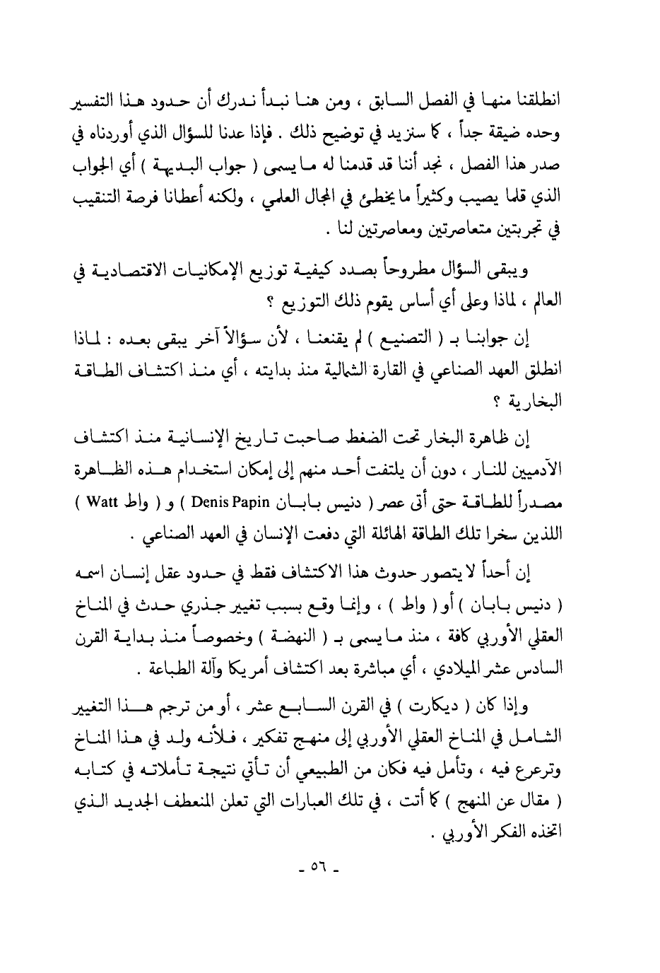 إن جوابنا بـ (التصنيع) لم يقنعنا، لأن سؤالاً آخر يبقى بعده: لماذا انطلق العهد الصناعي في القارة الشمالية منذ بدايته، أي منذ اكتشاف الطاقة البخارية؟