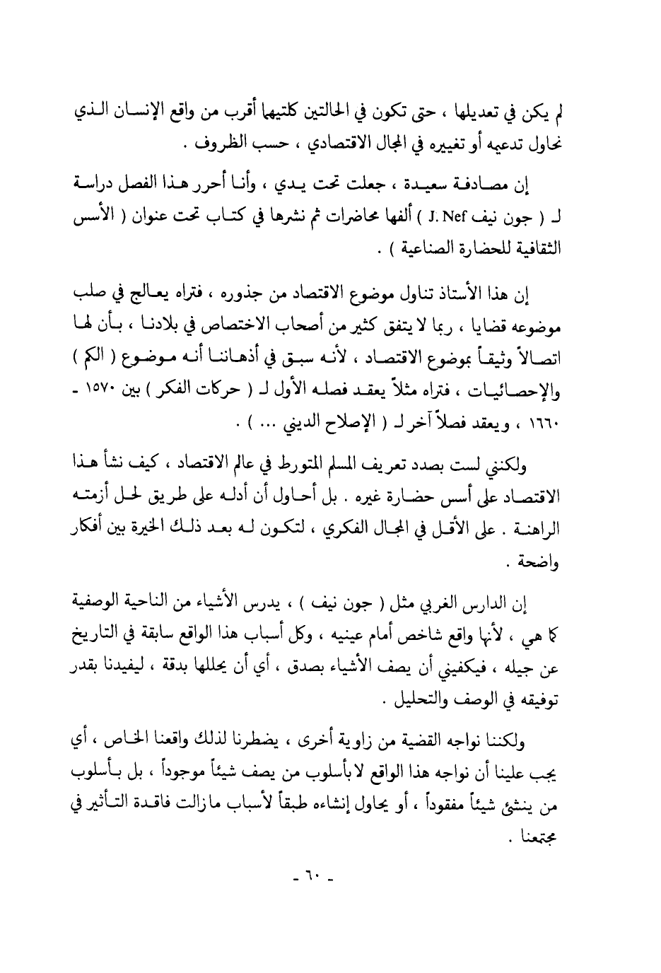 إن مصادفة سعيدة، جعلت تحت يدي، وأنا أحرر هذا الفصل دراسة لـ (جون نيف J. nef) ألفها محاضرات ثم نشرها في كتاب تحت عنوان (الأسس الثقافية للحضارة الصناعية).