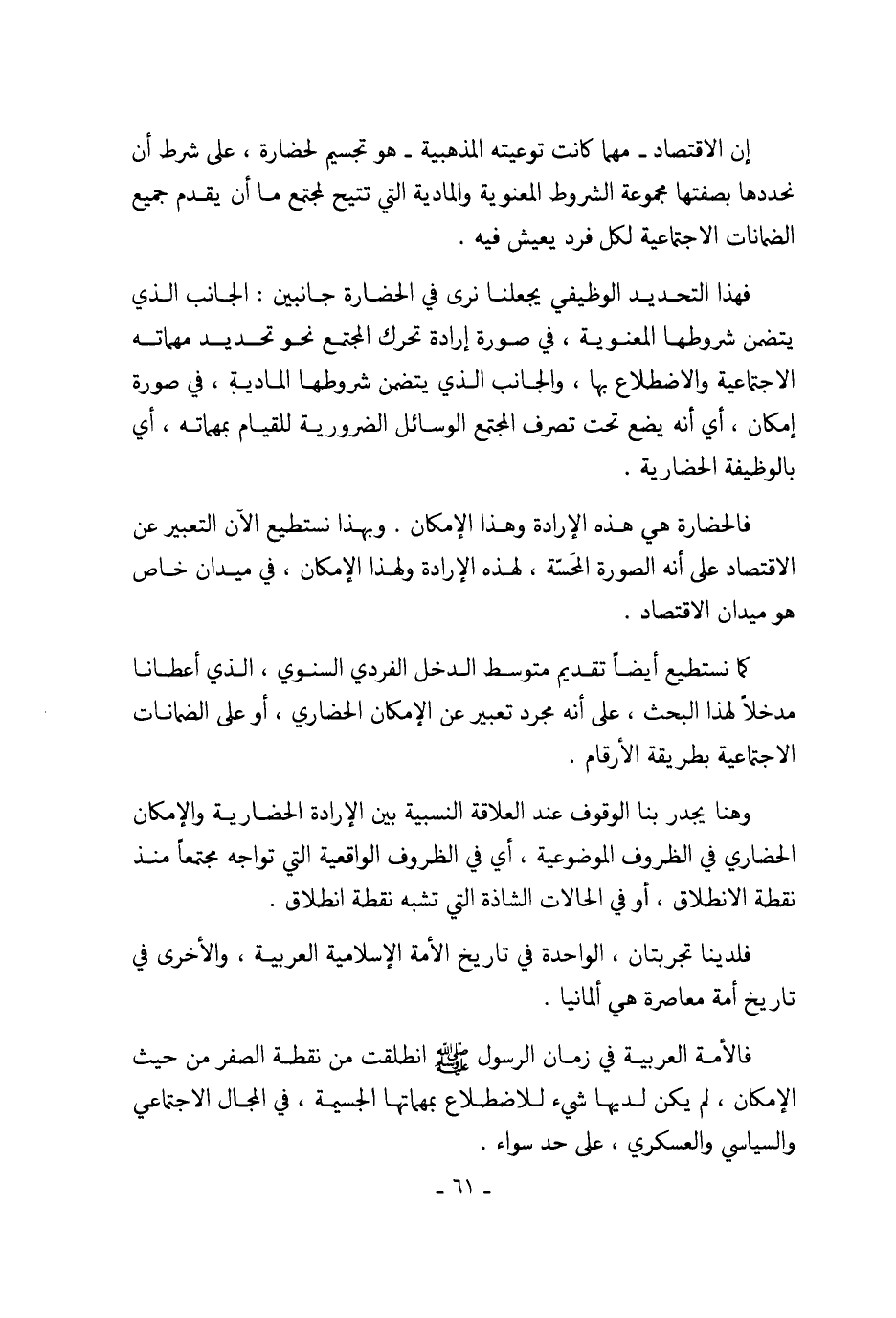 فالحضارة هي هذه الإرادة وهذا الإمكان. وبهذا نستطيع الآن التعبير عن الاقتصاد على أنه الصورة المحَسّة، لهذه الإرادة ولهذا الإمكان، في ميدان خاص هو ميدان الاقتصاد.