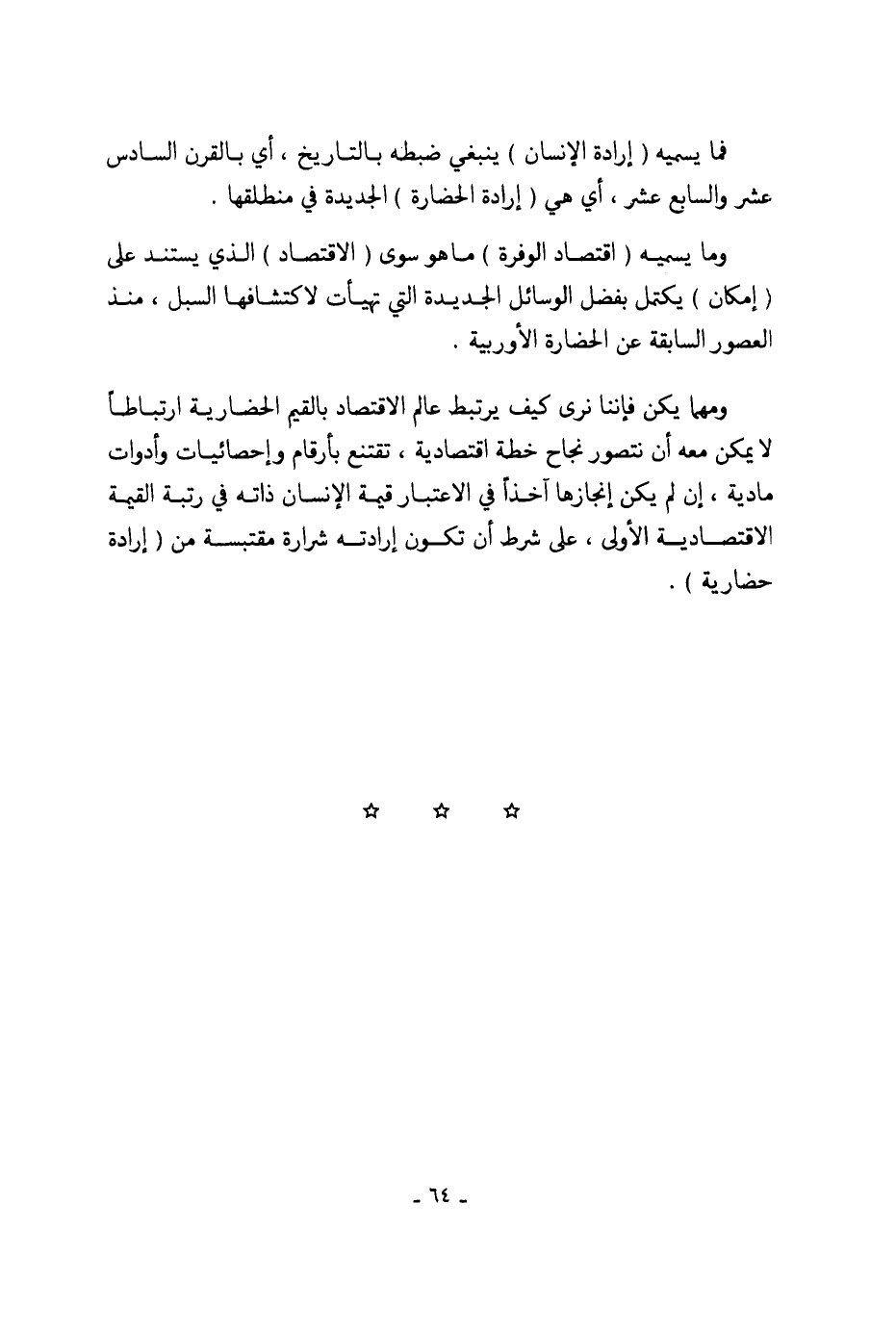 ومهما يكن فإننا نرى كيف يرتبط عالم الاقتصاد بالقيم الحضارية ارتباطاً لا يمكن معه أن نتصور نجاح خطة اقتصادية، تقتنع بأرقام وإحصائيات وأدوات مادية، إن لم يكن إنجازها آخذاً في الاعتبار قيمة الإنسان ذاته في رتبة القيمة الاقتصادية الأولى، على شرط أن تكون إرادته شرارة مقتبسة من (إرادة حضارية).