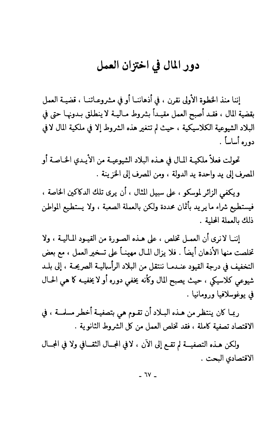 إننا لا نرى أن العمل تخلص، على هذه الصورة من القيود المالية، ولا تخلصت منها الأذهان أيضاً. فلا يزال المال مهيهناً على تسخير العمل، مع بعض التخفيف في درجة القيود عندما ننتقل من البلاد الرأسمالية الصريحة، إلى بلد شيوعي كلاسيكي، حيث يصبح المال وكأنه يخفي دوره أو لا يخفيه كما هي الحال في يوغوسلافيا ورومانيا.