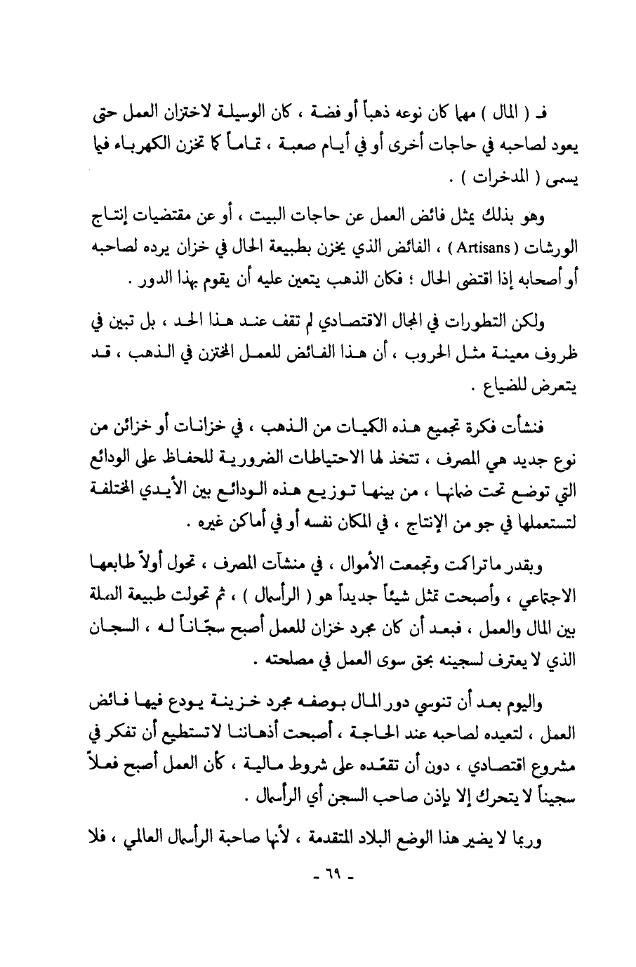 واليوم بعد أن تنوسي دور المال بوصفه مجرد خزينة يودع فيها فائض العمل، لتعيده لصاحبه عند الحاجة، أصبحت أذهاننا لا تستطيع أن تفكر في مشروع اقتصادي، دون أن تقعّده على شروط مالية، كأن العمل أصبح فعلاً سجيناً لا يتحرك إلا بإذن صاحب السجن أي الرأسمال.