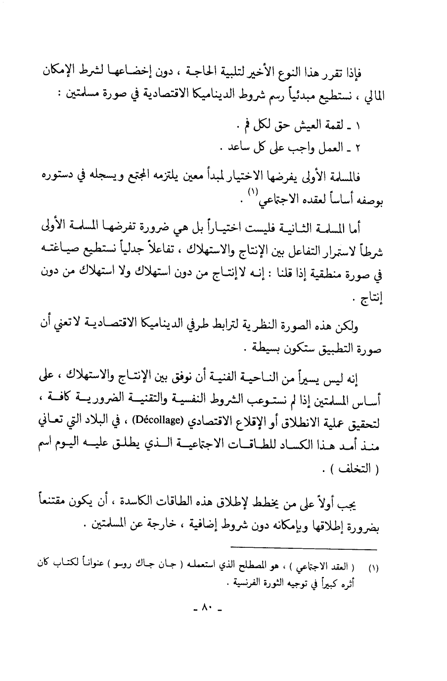 إنه ليس يسيراً من الناحية الفنية أن نوفق بين الإنتاج والاستهلاك، على أساس المسلمتين إذا لم نستوعب الشروط النفسية والتقنية الضرورية كافة، لتحقيق عملية الانطلاق أو الإقلاع الاقتصادي ( Décollage) ، في البلاد التي تعاني منذ أمد هذا الكساد للطاقات الاجتماعية الذي يطلق عليه اليوم اسم (التخلف).
