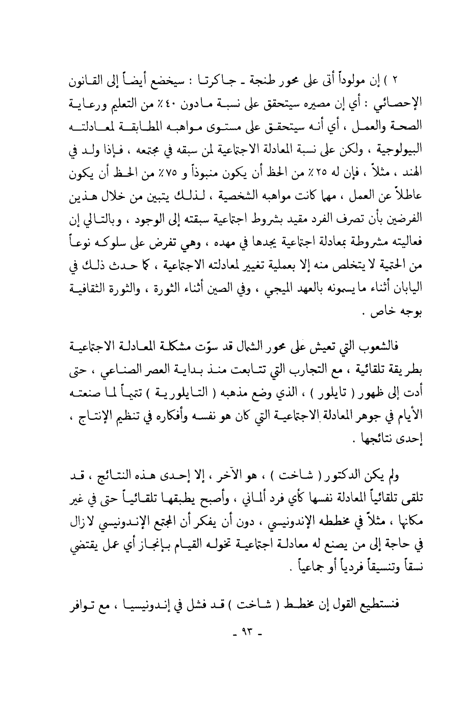 2) إن مولوداً أتى على محور طنجة - جاكرتا: سيخضع أيضاً إلى القانون الإحصائي: أي إن مصيره سيتحقق على نسبة ما دون 40% من التعليم ورعاية الصحة والعمل، أي أنه سيتحقق على مستوى مواهبه المطابقة لمعادلته البيولوجية، ولكن على نسبة المعادلة الاجتماعية لمن سبقه في مجتمعه، فإذا ولد في الهند، مثلاً، فإن له 25% من الحظ أن يكون منبوذاً و 75% من الحظ أن يكون عاطلاً عن العمل، مهما كانت مواهبه الشخصية، لذلك يتبين من خلال هذين الفرضين بأن تصرف الفرد مقيد بشروط اجتماعية سبقته إلى الوجود، وبالتالي إن فعاليته مشروطة بمعادلة اجتماعية يجدها في مهده، وهي تفرض على سلوكه نوعاً من الحتمية لا يتخلص منه إلا بعملية تغيير لمعادلته الاجتماعية، كما حدث ذلك في اليابان أثناء ما يسمونه بالعهد الميجي، وفي الصين أثناء الثورة، والثورة الثقافية بوجه خاص.