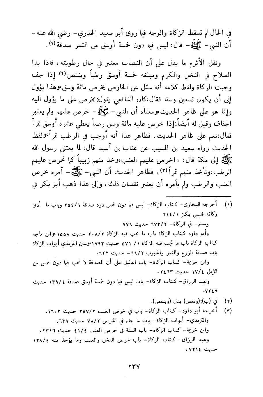 ونقل الأثرم ما يدل على أن النصاب معتبر في حال رطوبته، فإذا بدا الصلاح في النخل والكرم ومبلغه خمسة أوسق رطباً وينقص إذا جف وجبت الزكاة ولفظ كلامه أنه سئل عن الخارص يخرص مائة وسق، وهذا يؤول إلى أن يكون تسعين وسقاً فقال: كان الشافعي يقول: يخرص على ما يؤول إليه وإنما هو على ظاهر الحديث، ومعناه أن النبي ـ صلى الله عليه وسلم خرص عليهم ولم يعتبر الجفاف وقيل له أيضاً: إذا خرص عليه مائة وسق رطباً يعطي عشرة أوسق تمراً فقال: نعم على ظاهر الحديث. فظاهر هذا أنه أوجب في الرطب تمراً، ولفظ الحديث رواه سعيد بن المسيب عن عتاب بن أسيد قال: لما بعثني رسول الله إلى مكة قال: اخرص عليهم العنب، وخذ منهم زبيباً كما تخرص عليهم الرطب، وتأخذ منهم تمراً فظاهر الحديث أن النبي ـ صلى الله عليه وسلم أمره بخرص العنب والرطب ولم يأمره أن يعتبر نقصان ذلك، وإلى هذا ذهب أبو بكر في