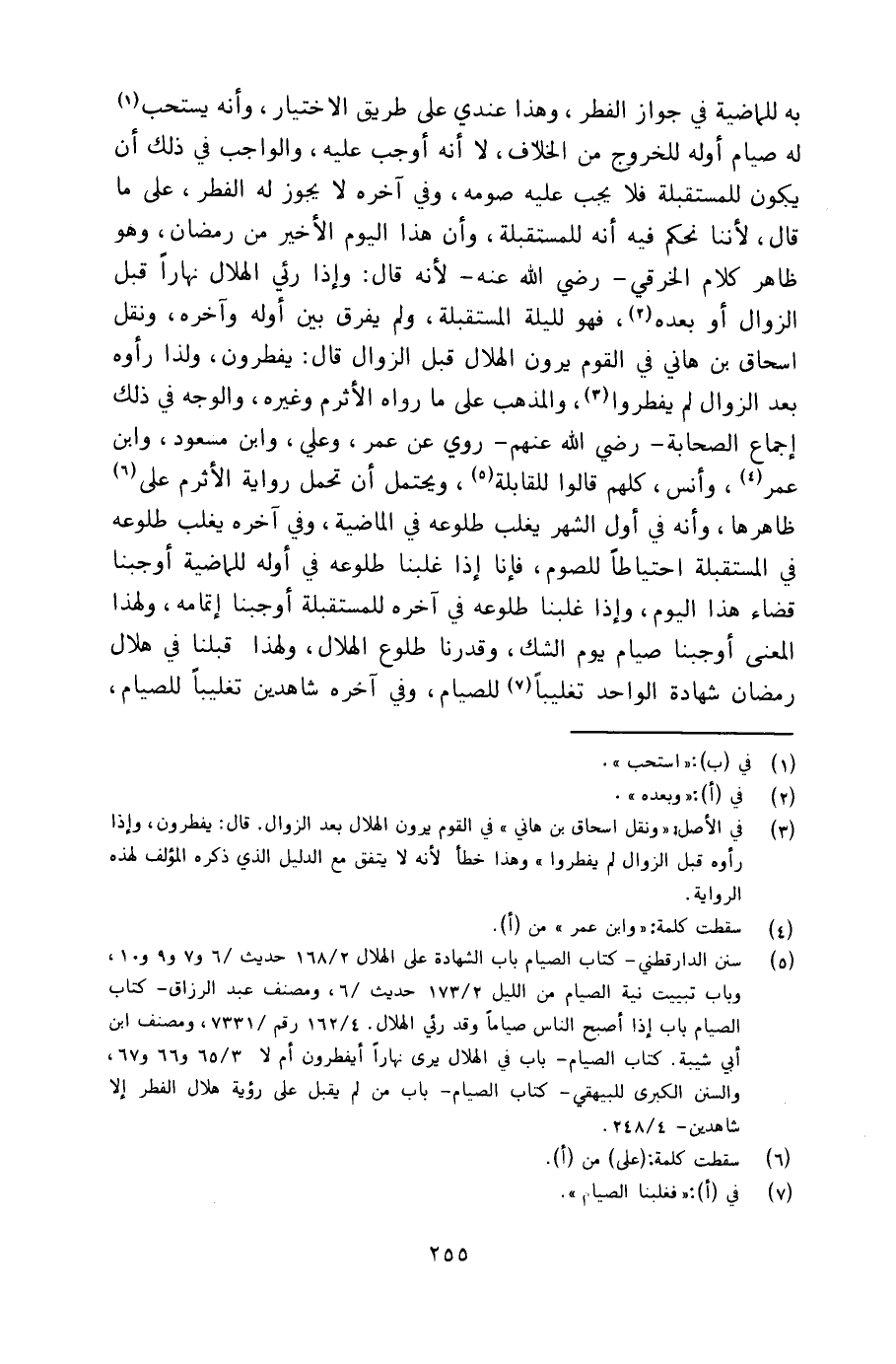 به للماضية في جواز الفطر، وهذا عندي على طريق الاختيار، وأنه يستحب له صيام أوله للخروج من الخلاف، لا أنه أوجب عليه، والواجب في ذلك أن يكون للمستقبلة فلا يجب عليه صومه، وفي آخره لا يجوز له الفطر، على ما قال، لأننا نحكم فيه أنه للمستقبلة، وأن هذا اليوم الأخير من رمضان، وهو ظاهر كلام الخرقي ـ رضي الله عنه ـ لأنه قال: وإذا رئي الهلال نهاراً قبل الزوال أو بعده، فهو لليلة المستقبلة، ولم يفرق بين أوله وآخره، ونقل إسحاق بن هانىء في القوم يرون الهلال قبل الزوال قال: يفطرون، وإذا رأوه بعد الزوال لم يفطروا، والمذهب على ما رواه الأثرم وغيره، والوجه في ذلك إجماع الصحابة ـ رضي الله عنهم ـ روي عن عمر، وعلي، وابن مسعود، وابن عمر، وأنس، كلهم قالوا للقابلة، ويحتمل أن تحمل رواية الأثرم على ظاهرها، وأنه في أول الشهر يغلب طلوعه في الماضية، وفي آخره يغلب طلوعه في المستقبلة احتياطاً للصوم، فإنا إذا غلبنا طلوعه في أوله للماضية أوجبنا قضاء هذا اليوم، وإذا غلبنا طلوعه في آخره للمستقبلة أوجبنا إتمامه، ولهذا المعنى أوجبنا صيام يوم الشك، وقدرنا طلوع الهلال، ولهذا قبلنا في هلال رمضان شهادة الواحد تغليباً للصيام، وفي آخره شاهدين تغليباً للصيام،